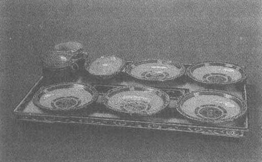 释义 | 云纹漆案及漆杯盘 云纹漆案及漆杯盘西汉。高5厘米,长60.2厘米,宽40厘米。1972年湖南省长沙市马王堆1号汉墓出土。湖南省博物馆藏。案是古代进食用的盘。此案木胎,长方形,平底,底部四角设有2厘米的矩形足。案内髹红、黑漆地各两组,交错分布,并在黑漆地上,饰朱、灰绿两色云气纹,外壁黑漆地上,绘朱、褐两色几何云纹。底部髹黑漆,并书以朱漆“轪侯家”三字。案出土时,上面附置5个小漆盘,1个耳杯,2个卮,1双竹箸和竹串等。盘、杯、卮的装饰手法与案相似。小盘底内均有朱书“君幸食”三字。有人认为,这种陈设可能是模拟死者生前宴饮的情景,它为研究汉代生活习俗提供了重要实物资料。此案与盘、耳杯、卮等纹饰流畅,色泽明亮,是西汉漆器的优秀作品。 ☚ 云纹漆耳杯盒 “君幸食”漆盘 ☛ |