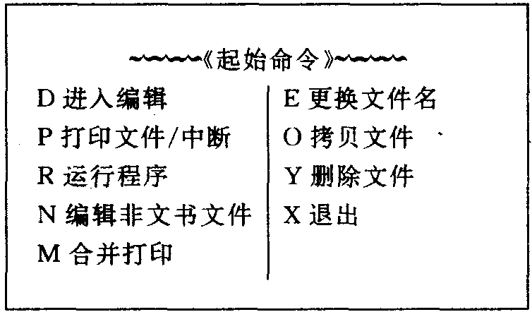 输入要执行的程序名后,程序开始执行,运行完后回到《起始命令》表。 三、编辑非文书文件N N命令用来编辑源程序文件和非文书文件。其操作与D命令相似。 四、更换文件名E E命令是将原文件换名,但文件内容不变。输入E后,屏幕显示