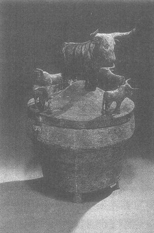| 释义 | 五牛铜针线盒 五牛铜针线盒春秋。通高31.2厘米。云南省江川李家山出土。云南省博物馆藏。盒上圆下方,平底,四足扁平。盒有盖,盝顶,上饰五立牛。通体饰纹:有盘蛇、竹节、编织、流云纹等。李家山、石寨山出土青铜器中,牛的形象极多,塑造也最为精彩,这反映了当时以农业为主的滇族社会中,畜牧经济仍占有重要的地位。牛是一种重要的家畜,同时也是衡量财富的标志。值得注意的是:这些牛的形象均为长身、短腿、大弯角的斗牛形象,体形十分劲健僄悍。晋宁石寨山西汉时期的墓葬中曾出土有“斗牛铜扣饰”,表现了人在高围之中分上、中、下(或上、下)排列,观看放牛开斗的场面,不难使我们想到,牛在当时是象征勇武并以之为娱的古老习俗。