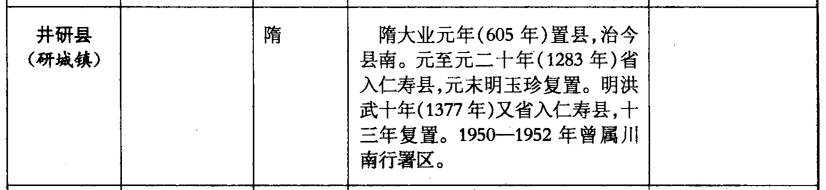 井研县(研城镇)隋隋大业元年(605年)置县,治今县南。元至元二十年(1283年)省入仁寿县,元末明玉珍复置。明洪武十年(1377年)又省入仁寿县,十三年复置。1950—1952年曾属川南行署区。
