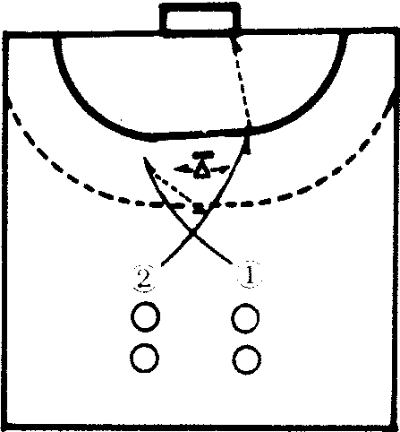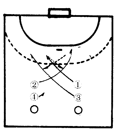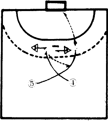 进攻队员利用交叉跑动互换位置并结合传球打乱对方防守部署,以达到射门和突破目的的简单配合。基本方法:O4号持球向防守队员△3号与△4号之间的空档切入。迫使对方关门防守,O5号由O4号身后交叉切入并接其传球突破