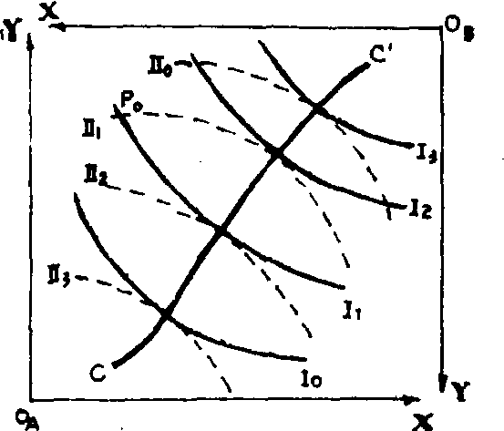 假定有A、B两人,有X、Y两商品。图中Ⅰ0、Ⅰ1、Ⅰ2、Ⅰ3为A的无差异曲线,Ⅱ0、Ⅱ1、Ⅱ2、Ⅱ3为B的无差异曲线。这些无差异曲线是按二人的满足程度排列的,离原点越远的,满足程度越高。联接两组无差异曲线切点轨迹的cc’曲线,称为契约曲线。通过市场上竞争和均衡,一定会使A、B双方达到契约线上的某一点。而一旦双方达到契约曲线上的某一点时,那就是社会的最优交换点。这是由于,在cc’曲线上各点,没有人能够移向较好的位置,而将他人推向较次的地位。在cc’曲线以后各点,却可以在不损及他人的情况下,使一个人的境况变得较好。因此,契约曲线上的任何一点都是两人两物交换的最优点。 在一定的收入、价格和偏好的基础上,交换双方就会在契约曲线上的某一点达成均衡。在这一均衡点,任何两种商品之间的边际替代率,对于使用这两种商品的每个人来说,必须是相等的。这就是所谓交换的最优条件。在未达到这一点之前,每一个人都能从继续换来的商品获得的效用大于他所放弃的效用。超过这一点的交换率,又必然会使一方或双方所丧失的效用超过所换来的效用。当收入、价格或偏好变化时,均衡点就会沿契约曲线移动。当整个市场达到均衡时,任何两种商品之间的边际替代率对所有消费者都相等。 |