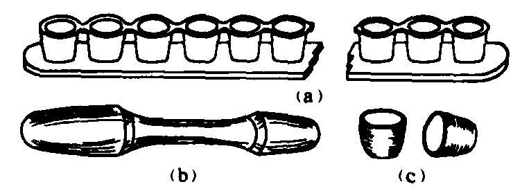 释义 | 人工台基artificial queen cell cup为育王和生产蜂王浆而制的人工王台基础。常用的有蜡碗(蜡制台基)和塑料台基。春季蜂群对台基的接受率高、泌浆多,台基口径以11~12毫米为宜; 夏秋季对台基接受率较低,可使用与自然台基相似的口径为9或10毫米的人工台基。蜡碗用蜡碗模棒蘸蜡制成,形似碗状,故称蜡碗,是养蜂业中沿用较久的人工台基,蜡碗棒一般用质地致密的小圆木制造,上粗下细,棒长约80毫米; 底端直径7毫米,呈光滑的半球形; 从底端向上10毫米处的直径约9~10毫米(见图)。制碗须用色浅、味浓的新鲜蜂蜡。融蜡温度保持在70℃左右。事先将蜡碗棒放入清水中浸透,最好备几根轮流蘸制。蘸制时,甩去水滴,垂直插入蜡液中蘸蜡,连续3~5次; 首次插入深度为10毫米,以后逐次减少约1毫米,使蜡碗底厚口薄。蘸好后放入凉水中片刻后取出,脱下蜡碗。大量制作蜡碗时,可把10~20根蜡碗棒嵌在一块小木板上,如上法一次蘸制多个蜡碗。塑料台基是用无毒塑料注塑成型,有单个和条状两种。后者每条有20~30个台基。塑料台基的接受率高,产浆量高,杂质少,易清扫; 移虫取浆,安装清理都很方便,可多次使用,有利于机械化采收王浆。 蜡碗棒和人工台基 此外还有木制人工台基、橡胶人工台基。 |