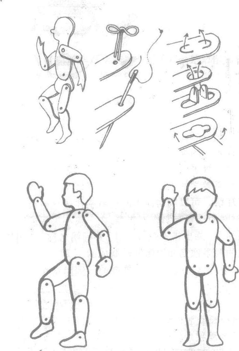 用于人物画教学,可摆出某些动态的模型。在美术教学中,画出不同的人物动态是小学生难以掌握的。教师动手制作人体动态教具来辅助教学,可以取得良好的教学效果。这种教具突出人体的关节部位,使学生便于掌握不同动作的人物。这种教具有两种。一种是用卡纸制作的(如图1),分为正面和侧面两个活动人形。由头、躯干、四肢三大部分组成,颈、肩、肘、髋、膝关节是由分解的部分重叠结合起来用金属丝弯成8字钉,在轴两侧加垫片,既固定又能活动。恰当地使用这个教具对低中年级学生非常有用,效果很好。有条件的教师还可以印出图纸,让每个学生各做一套,在创作课上应用,另一种是人形活动教具,采用空心的竹、木制成的。可以全方位转动使用 (如图2),由头、颈、躯干、骨盆和四肢几部分组成。按一定长短比例,截断材料,在关节部位加上一粒珠形结构,空心中贯穿一根金属丝,这样就可以模拟人体的多种动作。这种教具对高年级学生的创作课教学很有用处。香椿木嫩枝或多年生灌木都有组织疏松的髓,可以便于穿孔和制作。