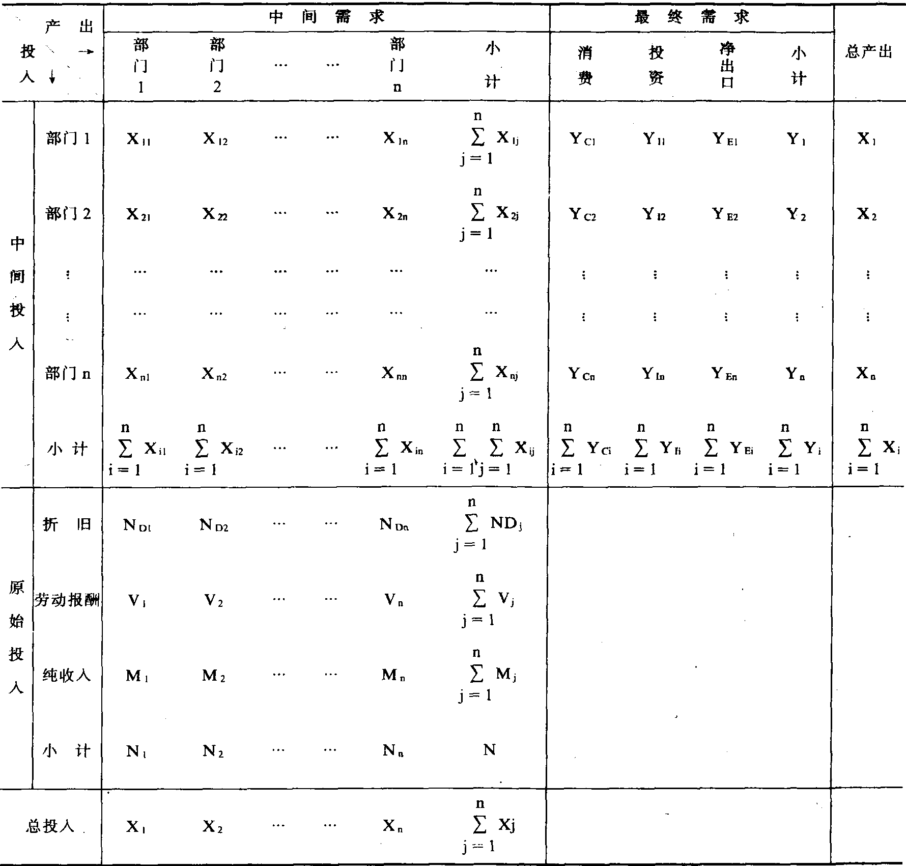 注: Xij代表j部门在生产过程中所消耗的i部门产品量。Yi代表i部门产品的最终使用量。 ☚ 投入产出表 实物型投入产出表 ☛ |