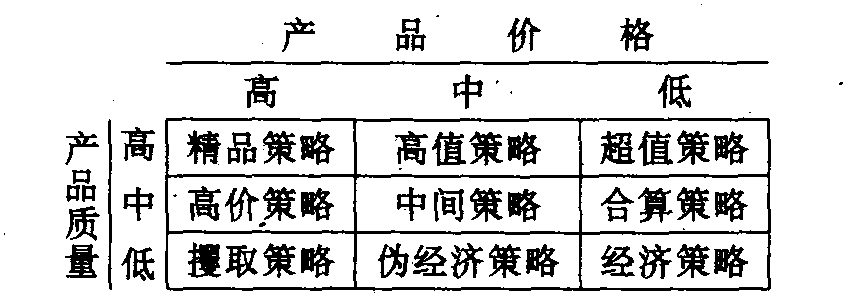 仿制品是企业模仿市场上现有产品而研制出的新产品。由于市场上已有现成的同类产品,仿制品仅仅对企业而言是新产品,因此仿制品定价的关键就是市场定位问题。通常生产仿制品的企业需在价格和质量两方面确定其市场定位,下图展示了九种可能的“价格一质量”组合情况。这里,企业必须考虑其中每一个市场的容量,可能的需求增长速度和潜力,以及竞争对手的反应等因素,选择适当的市场定位,并采取相应的定价策略。