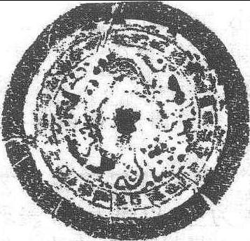 释义 | 仿唐禽兽葡萄镜金代生活用具。计2件,皆由吉林市博物馆收藏。两面铜镜皆黄铜铸造。形制、大小、纹饰相近,属同类镜。均为圆形。龟钮。在钮周围有一周隐约可见的凸弦纹,构成圆平钮座。在钮座周围皆有四只形态似狮的瑞兽浮雕式图案,作逆时针方向绕钮奔驰,其间衬以不清晰的缠枝葡萄浮雕式图案。是为主题纹饰。其外有一周内饰三角锯齿纹的高圈,将镜背分为内外两区。外区纹饰不尽相同。其一,直径10.6、身厚0.4—0.5、缘厚0.6、钮高0.7厘米,其二,直径10.5、身厚0.1—0.25、缘厚0.5、钮高0.5厘米。 仿唐瑞兽铭文镜 |