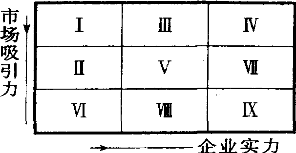 九象限决策法亦称为GE矩阵,产品系列平衡法或投资分类管理法。由美国通用电器工司首创。它是在企业资金一定的情况下,为实现企业战略目标而进行的增加投资或回收投资的全面优化的方法。它以产品的市场吸引力和企业实力为依据,对产品进行综合的评价,以使企业做出正确的战略决策。市场吸引力所包括的因素有: 产品平均赢利水平、产品寿命周期、技术变化发展的趋势、受季节影响的程度、市场容量、市场竞争力、投资报酬率等等; 企业实力所包括的因素有: 经营管理能力、应变能力、信息处理能力、销售能力、技术能力、成本控制能力和售后服务能力等等。运用这种方法,是在对企业产品的上述各因素打分后汇总,求得企业产品的市场吸引力总分和企业实力的总分,并按照大中小分成三个等级。市场吸引力的三个等级和企业实力的三个等级排列组合后,形成不同的九种组合 (如图G),对于这些不同的组合,企业必须采取不同的战略决策。