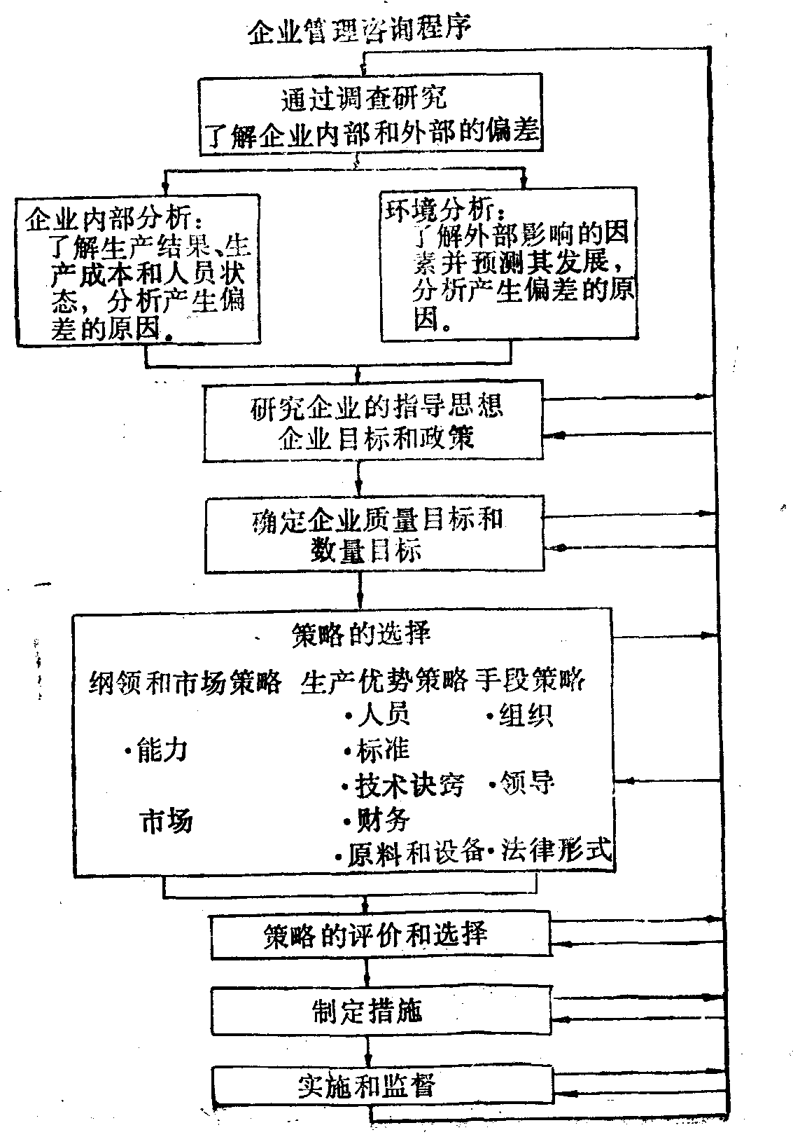 企业管理咨询工作的过程和步骤。可分为: (1) 预备咨询。咨询小组在进厂前,对接受咨询企业进行的调查摸底和初步活动以及一些必要的组织筹备工作。其目的在于初步预测可能发生问题的领域,以便决定咨询的基本方向。内容主要有: 咨询公司与接受咨询企业之间洽商; 事前调查; 制订诊断计划书; 签订企业咨询合同。(2) 正式咨询。预备咨询的深入和发展,也是企业咨询的核心阶段。主要是围绕确定的咨询计划和改进课题,进行深入细致的分析研究和改进革新活动。其主要内容有: 综合调查分析; 专题调查分析; 制订改善方案;签订事后指导合同。(3) 实施指导。主要是采取具体措施,落实正式咨询阶段所提出的改进方案,以便使企业能够获得实际的效果。其基本工作有: 制订负责改进活动的管理体制,普及必要的知识与技术培训,指导实施改进方案。