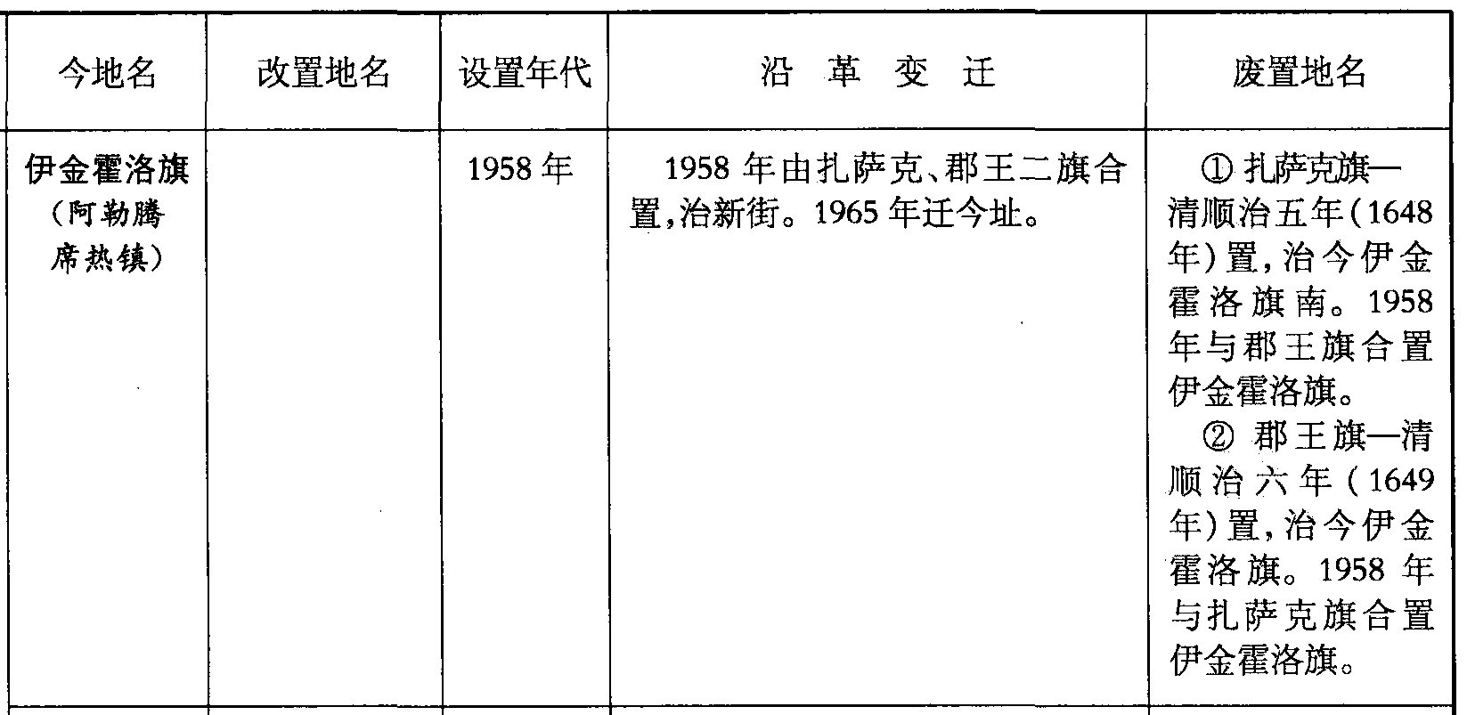 伊金霍洛旗(阿勒腾席热镇)1958年1958年由扎萨克、郡王二旗合置,治新街。1965年迁今址。❶扎萨克旗—清顺治五年(1648年)置,治今伊金霍洛旗南。1958年与郡王旗合置伊金霍洛旗。❷ 郡王旗—清顺治六年(1649年)置,治今伊金霍洛旗。1958年与扎萨克旗合置伊金霍洛旗。