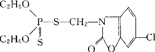 伏杀硫磷phosalone广谱性二硫代磷酸酯类杀虫杀螨剂,又名伏杀磷。化学结构式:  1963年法国罗纳普朗克公司(Rnone-Poulenc Phy-tosanitaire)首先开发。 性能 纯品为无色结晶,微具蒜臭气味,熔点48℃。挥发性小。化学稳定性高,可与多种农药包括碱性药物混用。不溶于水,室温下水中溶解度为10毫克/升,可溶于多数有机溶剂,不溶于脂肪烃。对高等动物急性口服毒性中等,急性经皮毒性较低。大白鼠急性口服LD50135~170毫克/千克(雌),120毫克/千克(雄);兔急性经皮LD501530毫克/千克。无慢性毒性。一般使用情况下对蜜蜂低毒,对天敌昆虫影响较小。伏杀硫磷对害虫具有胃毒和触杀作用,有内渗作用,无内吸作用。 应用 伏杀硫磷主要以乳油或可湿性粉剂对水喷雾,用于果树、棉花、水稻、蔬菜、茶树等作物,防治蚜虫、叶螨、木虱、叶蝉、蓟马及鳞翅目、鞘翅目害虫。速效性好,残留量低。在植物上持效期为两星期,对叶螨的持效期较短。正常使用下无药害。伏杀硫磷phosalone又称伏杀磷、Zolone、Rubitox。无内吸作用有机磷杀螨、杀虫剂。化学名称:O.O-二乙基-5-(6-氯苯并恶唑酮-3-基)甲基二硫代磷酸酯。化学结构式如下。工业纯品为无色晶体,略有蒜味,熔点45~47℃,溶解度25℃时水0.01 g/L、甲醇及乙醇200 g/L,丙酮、苯、氯仿、环己烷、甲苯、二甲苯1 000 g/L。急性口服毒性,小鼠LD50为180 mg/kg,大鼠为1 500 mg/kg,兔>1 000 mg/kg。两年饲喂试验无作用剂量大鼠250 mg/(kg ·d)、狗为290 mg /kg、对鱼毒性,鲤LC50为1.2 mg/kg(48 h)属中等毒性。在动物体内易分解。土壤中半衰期7天。苹果树用药10天后收获果实上残留低于2 mg/ kg。防治各种果树螨类、蚧、粉蚧、木虱,还可以防治棉叶螨、棉红铃虫、象甲类、蓟马、蚜虫类。