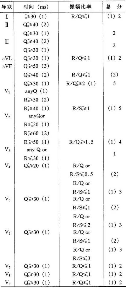 释义 | QRS记分法 系依据QRS振幅来判断左心室射血情况和急性心肌梗死范围的一种方法。 QRSs>3,可作为左心室射血分数(LVEF)异常指标,敏感性93%,特异性88%。LVEF%=60-(3×QRSs)或59.58-2.16×QRSs。急性心肌梗死范围(ck·g·Eq)=5.24×QRSs+8.5。QRS记分法见下表: |