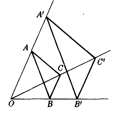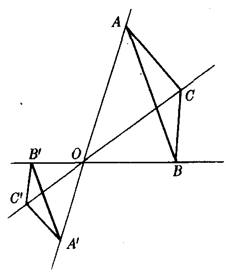 一种几何变换.设O为平面上一定点,若某变换把平面上任意一点A变为直线OA上一点A′,并且|OA′|=k|OA|,k≠0,则称这种变换为平面到它自身的位似变换,O为位似中心,k为位似比或位似系数.当k>0时,点A和A′位于直线OA上点O的同侧,称这种位似变换为正向位似变换,或顺位似变换,O为外位似中心(图1);当k<0时,点A和A′在直线OA上点O的两侧,称这种位似变换为反向位似变换,或逆位似变换,O为内位似中心(图2).