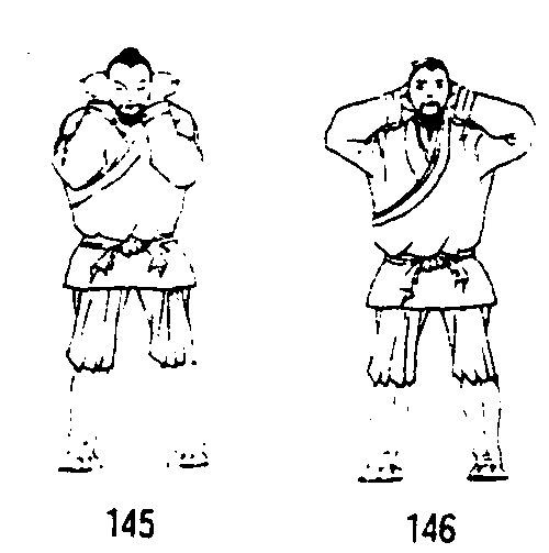 四十九式经络动功第3段“导气”动作之十二(全套动作顺序第三十四式):❶头向下低垂,下颏触及胸骨;同时两肘内收使肘尖朝下,两掌心覆盖耳轮上部,指尖朝后(图145)。❷将头竖直;同时两肘外张。两掌复还脑后;眼平视前方。(图146)要求:呼吸自然,低头不躬身;其他与“左右睡枕”的要点相同。