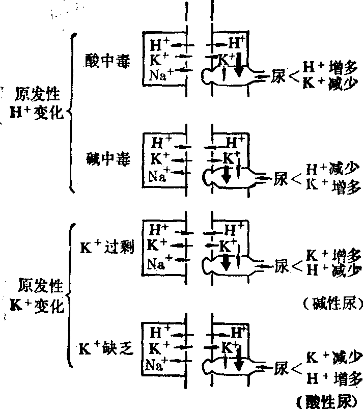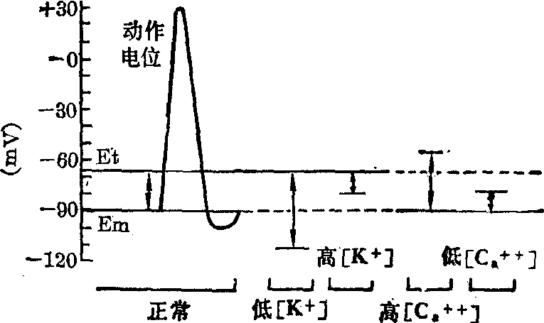 这些由于钾在机体内重新分布所引起的低钾血症,虽然血钾降低,但细胞内钾反而增加,因此机体的总钾量不变。 除上述原因外,食用粗制棉籽油也可能引起低钾血症,但详细机制尚不清楚。此外,低镁血症、高钙血症时,也可伴有低钾血症。低镁血症时,可能由于细胞膜上的Na+-K+-ATP酶活性受抑制,以致尿钾排出增加而导致机体缺钾。高钙血症时,可能由于发生了肾小管性酸中毒,致使肾排钾增加而引起低钾血症。 2. 机体功能和代谢变化: (1) 神经肌肉系统的变化: 低钾血症时的主要临床表现为全身肌无力(一般出现于血清钾低于3mEq/L时),甚而出现弛缓性肌麻痹(血清钾低于2.5mEq/L时)。通常以四肢肌麻痹为最显著,严重时可出现呼吸肌麻痹。低钾引起肌无力、肌麻痹的机制,主要在于血钾降低引起细胞内外钾即[K+]i/[K+]e比值增大,使细胞静息电位(Em)升高(即负值变大),静息电位与阈电位(Et)的差值(Em-Et)加大,以致细胞兴奋性降低(图2)。此外,钾又是细胞内多种酶类(如三磷酸腺苷酶、丙酮酸激酶等)的激活剂,因此,长期低钾血症并发细胞内缺钾时,可由于有关酶活性的降低而使肌肉收缩所必需的能量释放不足,从而导致肌肉收缩力下降。此外,低钾血症还可影响细胞膜内Na+-K+-ATP酶活性,使维持细胞膜内外Na+、K+浓度差所必需的能量释放不足,从而造成细胞内钾外流和细胞内缺钾,也是骨骼肌兴奋性异常的原因之一。然而,与急性钾缺乏相比,在慢性钾缺乏时,其肌无力和肌麻痹症状常常不甚明显。这可能是由于慢性钾缺乏时在低血钾的同时,细胞内也出现了缺钾,以致[K+]i/[K+]e比值变小或相对不变,静息电位亦可变小或相对不变。因此,在阈电位不变的情况下,Em-Et亦随之缩小或无变化,因而细胞的兴奋性可维持不变。 图2 细胞外液K+、Ca++浓度对骨骼肌静息电位和阈电位的影响 严重缺钾可致骨骼肌发生肌细胞空泡变性,横纹消失,肌纤维溶解、断裂等形态改变。患者因而可发生肌球蛋白尿。有人认为缺钾时肌肉形态学的改变与钾不能充分参与骨骼肌血流的调节有关。因为在正常情况下,随着肌肉的运动,细胞所释放的钾可使局部血管扩张,从而使肌肉的血流和营养供应有所增加。当钾缺乏时,由于细胞释放钾减少,这种血流调节功能发生障碍,因而肌细胞可发生营养不良性改变。 (2) 心脏的变化: 低钾血症时心脏的主要变化是心律失常,严重时可发生心室颤动。长期缺钾可由于心肌受损而心脏扩大,甚而发生心力衰竭。心电图变化主要是T波低平,出现u波,Q-T、P-R间期延长和QRS波群变宽等。这一方面可能是由于低钾血症时,心肌细胞钾外流孔道的开放受抑制,使复极速度减慢,复极末期延长,故出现T波低平,Q-T间期延长和出现u波;另方面是由于低钾血症时,钠通道的开放减弱,使动作电位上升的速度和幅度均下降,而引起递减性传导,出现QRS波群增宽和P-R间期延长。由于心肌复极速度减慢和递减性传导,就给出现心律失常提供了生理学基础。但应指出,低血钾时出现的心脏变化,不仅取决于低血钾发生的程度、速度和时间,也决定于其他电解质的平衡状态。 长期缺钾可导致心肌细胞空泡变性,甚而出现肌纤维断裂、坏死和疤痕形成。 (3) 肾脏的变化: 慢性低钾血症时肾脏的主要变化是浓缩功能的减弱,因此患者出现多尿、低比重尿以及由此而产生的烦渴和多饮。当机体失钾量超过200mEq时,尿渗透压可由正常的390~1200mOsm/L,降至300~400mOsm/L。其机制可能与髓襻升支粗段对Cl-、Na+向髓质间质的转运发生障碍有关。此外,长期缺钾可致肾近曲小管(偶在远曲小管)发生空泡变性和细胞肿胀,集合管上皮细胞可发生水样变性。电子显微镜下可见肾小管上皮细胞线粒体肿胀,肾小管周围基底膜增厚和不规则。这些变化可能和肾小管上皮细胞对抗利尿激素的反应性降低,肾浓缩功能减弱有关。 (4) 消化系统变化: 钾也是维持平滑肌紧张度所必需的电解质,低钾血症时,可发生肠蠕动减弱。临床上,可见患者出现腹胀、便秘,严重时可发生恶心、呕吐,甚而导致麻痹性肠梗阻。呕吐可使胃液大量丢失,从而加重钾的缺乏。 (5) 中枢神经系统变化: 轻度低钾血症时患者可出现精神紧张、烦躁不安;重症者精神萎靡、神志模糊、嗜睡甚至昏迷。其发生机制主要是低钾血症可使神经细胞糖代谢障碍,以致能量产生不足。近年证实,脑内Na+-K+-ATP酶具有很强的活性,而当钾缺乏时该酶的活性受抑制,致使神经细胞膜的离子主动转运功能发生紊乱,也是中枢神经系统功能紊乱的重要原因之一。 (6) 酸碱平衡的变化: 严重低钾血症常伴有继发性碱中毒,也称低钾性碱中毒。其发生机制可能是: ❶当血钾浓度降低时,细胞内钾可向细胞外转移;与此同时,细胞外的Na+、H+可相应转入细胞内,从而导致细胞外碱中毒和细胞内酸中毒。 ❷在肾脏,由于肾小管上皮细胞向管腔中排H+多于排K+(见图1),HCO3-回收增多,尿呈酸性,称为反常性酸性尿。低钾性碱中毒较多见于长期使用排钾性利尿剂、肾上腺皮质激素分泌过多的疾病以及钾摄入不足等时。低钾血症与酸碱平衡紊乱的关系是复杂的。某些情况下,低钾血症亦可伴发酸中毒,例如,长期使用碳酸酐酶抑制剂和肾小管性酸中毒所致的低钾血症,即可伴有酸中毒。此外,在急性腹泻、糖尿病性酮症酸中毒以及输尿管-乙状结肠吻合术后的患者,也可见低钾血症伴发酸中毒。 (7) 其他变化: 在慢性低钾血症时