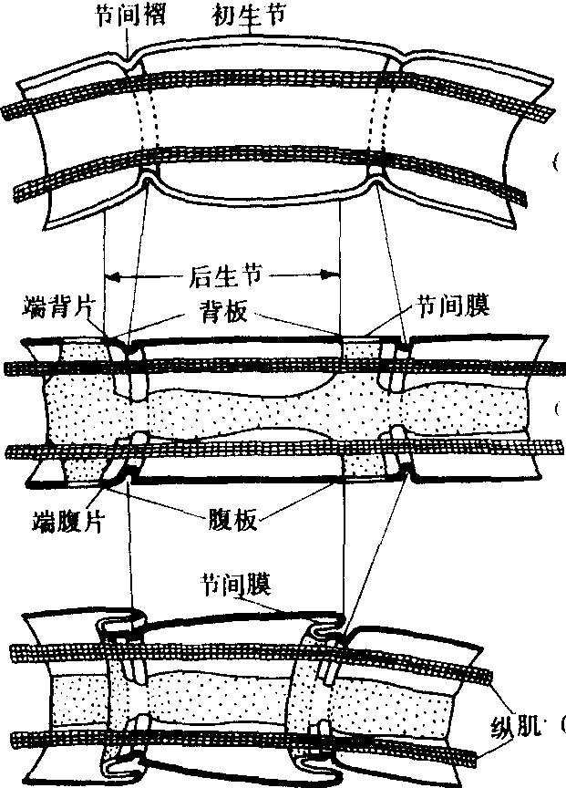 初生节 是以节间褶为分节界限的体节。体内的纵肌着生在节间褶上,纵肌收缩使虫体蠕动。这种原始的分节方式称初生分节 (primary segmentation),与胚胎时期的分节方式一致,仅见于一些昆虫的幼期,也与环节动物(Annelida)、有爪类(Onychophora)等相同。 后生节 是以节间膜为分节界限的体节; 即在体壁骨化时,原初生节的节间褶也骨化,但是骨化区并不与初生节完全一致,在节后部(节间褶之前)有一条未经骨化的部分。骨化的节间褶内部所形成的内脊上,着生的纵肌收缩时,不仅能使骨化节作相互活动,还能使两个邻节作部分的套叠。这种分节方式一般发生在节肢动物门,如昆虫成虫期的体节。头部各节已愈合,一般不存在节间痕迹。翅胸由于飞行的需要,骨板紧密相连,节间膜也不明显,唯腹部保留明显的节间膜。各节节间褶骨化在体节背面形成背板,腹面形成腹板。原节间褶在体表形成的沟称前脊沟,背板沟前的狭片称端背片,沟后的大块骨片称主背片; 腹板沟前的狭片称端腹片,沟后的部分称主腹片。 体节body segment,metamere又称环节。构成动物体的分段部分。无脊椎动物,自环节动物(如沙蚕、蚯蚓等)开始,身体出现分节现象,从前至后有许多相似(或不同)的环节,每一节都有神经节、环血管和排泄管等。脊索动物,低等的头索动物(如文昌鱼)成体仍保留着明显的分节现象,脊索两侧的中胚层有分段的体节,尤以肌节最为明显。高等的脊椎动物仅胚胎期在脊索两侧的背中胚层有明显的分段体节,可分化为生骨节、生皮节和生肌节,亦以生肌节最为发达,故常称为肌节。成体时分节现象消失或局部保留。 体节 体节tijie环节动物如蚯蚓等的身体由大致相同的环节所构成,这些环节特称为体节。每节都有神经节、环血和排泄管等。 ☚ 墨囊 疣足 ☛ 体节❶脊索动物胚胎期,脊索两侧的中胚层所呈现的分节。各节将分化为生骨节、生皮节和生肌节,以生肌节为最显著,故体节又称肌节。 体节somite从胚胎第20天开始,神经管两侧的轴旁中胚层自头端至尾端先后断裂成左右成对的细胞团。大约每天出现3对,至第5周末,共出现42~44对。这些呈节段性排列的细胞团,称体节。每个体节可分为生骨节、生肌节和生皮节三部分,分别产生该体节水平上的骨骼、横纹肌和真皮。胚胎学中常以体节的数目表示早期胚胎的胚龄。 体节somite |