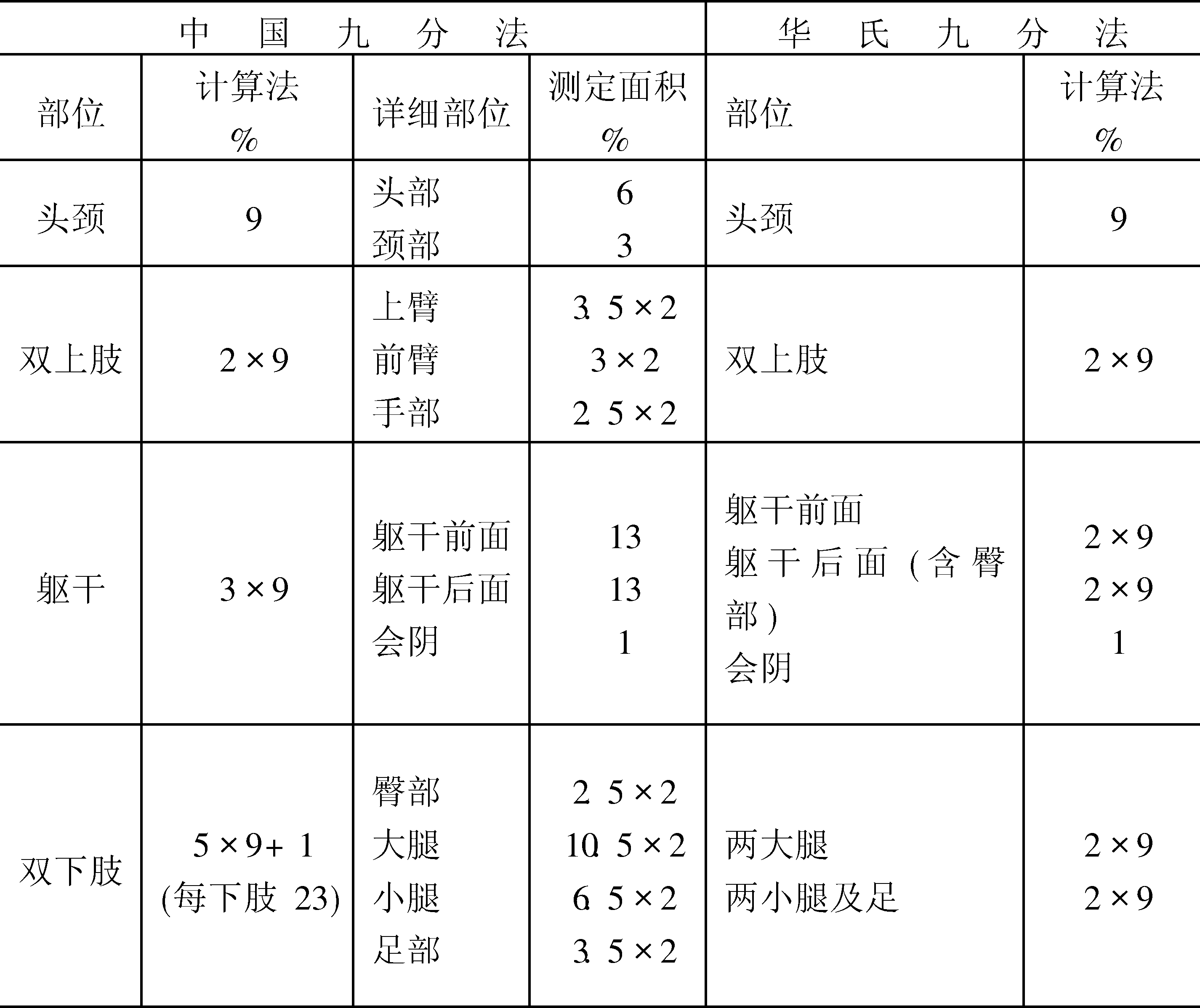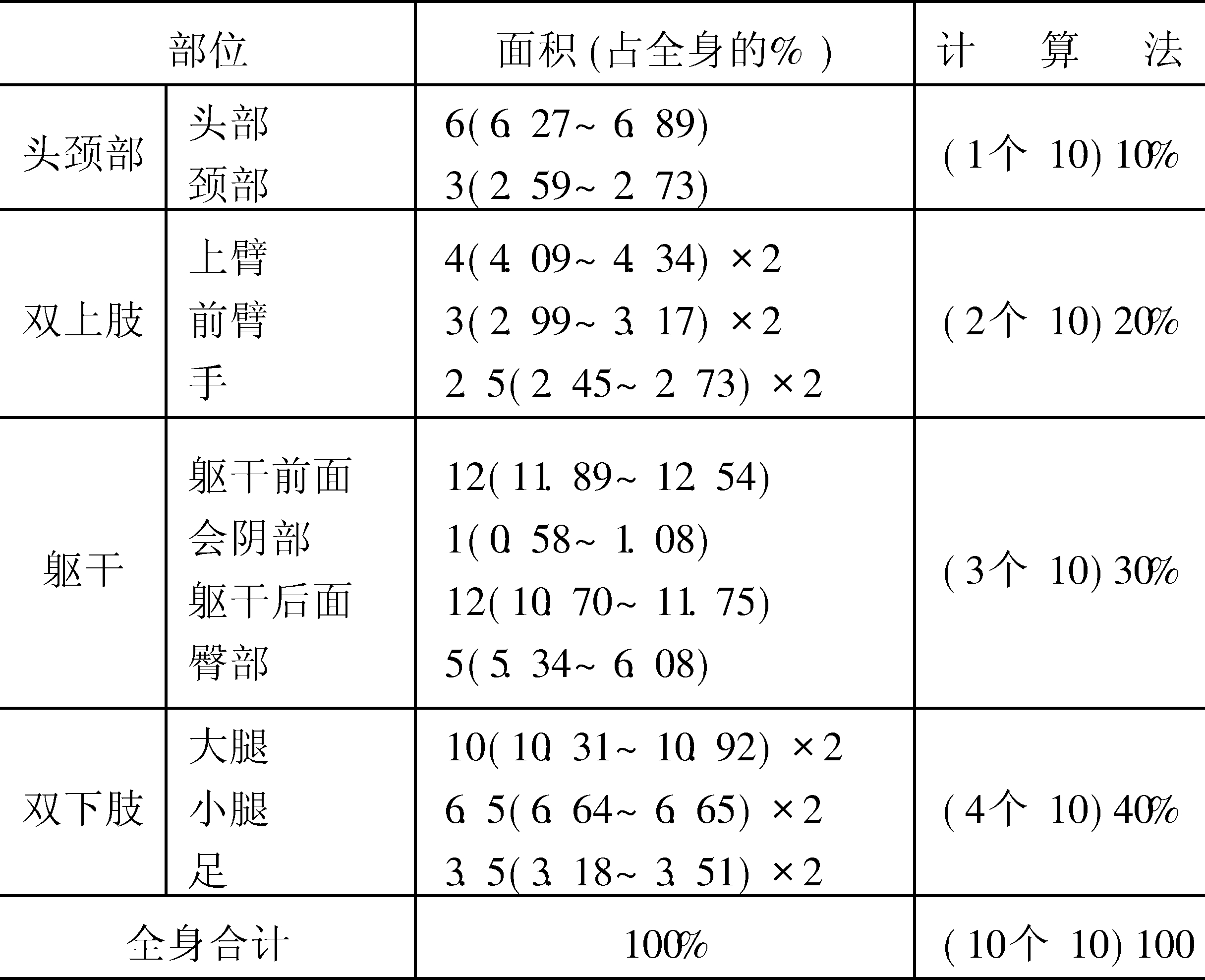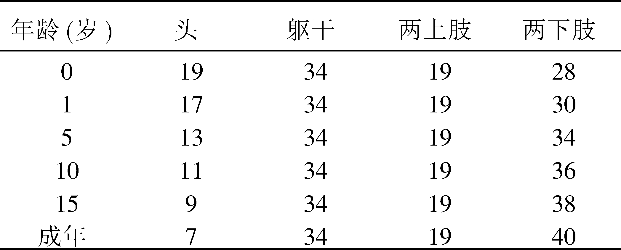 ❼手掌法 全手面积为体表总面积的2.5%,手和指的掌面面积为1.25%,手指并拢的掌面一侧面积为1%。应以病人自己的手掌为标准来估计体表某部位的体表面积。若病人的手与检查者的手大小相似,也可用检查者的手掌估计。 ❽伯科估计法 A.12岁以下:头及颈部占6%,躯干及会阴部占40%,上肢占16%,下肢(包括臀部)占38%。 B.12岁以上:头及颈部占6%;躯干占38%:其中前侧及会阴部占20%,后侧占18%;上肢占18%:其中手占4.5%,臂占13.5%;下肢占38%:其中足占6.4%,小腿占12.6%,大腿及臀部占19%。 ❾小儿体表面积估计法 A.头颈面积 占全身总面积的百分比为9+(12-年龄)。 B.两下肢面积 占全身总面积的百分比为41-(12-年龄)。 小儿全身体表面积可通过体重来估计:小儿体表面积(平方米)=小儿体重(公斤)×0.035+0.1 ☚ 肤纹 皮肤黏液性水肿 ☛ |