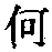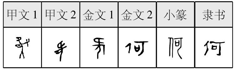 何 甲骨文; 金文; 篆hé[肩扛鋤,獨體象形。荷本字。(《説文》:“何,儋dān(擔古字,用肩挑)也。一曰誰也。從人。可聲。臣鉉等曰:儋何,即負何也。借爲誰何之何。今俗别作擔荷,非是”何,以肩承物,何,金文像人荷物之形。但是從金文到篆文在字形上起了重大的變化,人身〈亻〉與人口斷開,口置於戈下。李鏡池《通義》:“何,借爲荷,承受也。”(應該是“荷爲何的返還字)。借爲疑問詞〈何人、何處、何時、爲何〉。姓。)] 《詩經·曹風·侯人》:“彼侯人兮,何戈與祋duì(古代兵器,即殳shū)。”(那個侯人呀,肩扛戈棍呀。) [宋] 蘇軾《水調歌頭》:“不應有恨,何事長向别時圓?”(月圓本不該有恨,但是爲什麼老是在人們離别時圓起來呢?) 何hé(7画)