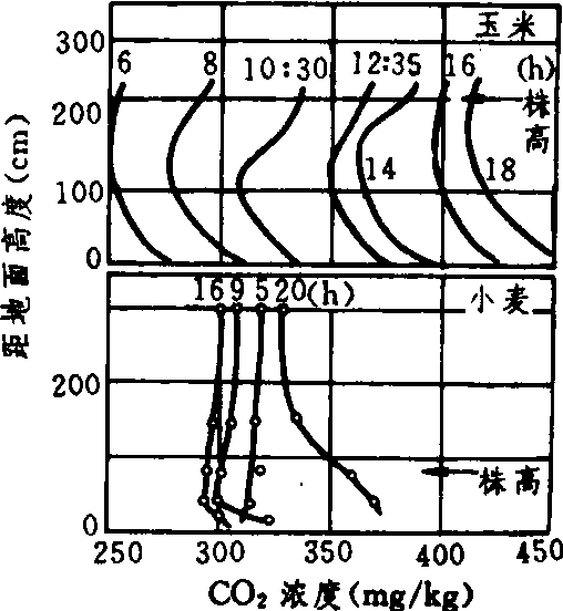 作物地二氧化碳carbon dioxide in crop fields作物地微气候要素之一。作物地CO2主要来自大气和土壤,且通过乱流交换作用输送到作物地。输送量的多少决定于乱流强弱以及作物层与大气上层之间CO2浓度的差值。农作物的光合作用和呼吸作用,使作物地中CO2浓度,具有明显日变化:昼间作物地中CO2浓度比较低,大气是CO2的“源”,作物地是CO2的“汇”(即“库”);夜间则相反,作物地CO2浓度较高,是CO2的“源”,大气则是“汇”。这样的“源”与“汇”日变化,使得作物地中CO2浓度的铅直廓线,具有某些特殊性:昼间因作物吸收CO2,使CO2浓度廓线最低值在作物层某一高度上出现,并由此向上、向下递增,称为同化型分布;而夜间由于作物的呼吸作用释放CO2,其CO2浓度的铅直廓线,由地面向上递减,称为呼吸型分布。此外,对水平叶较多的作物,上述变化不明显。天气条件和作物生长状况,对作物地CO2浓度变化也有很大影响。阴天或大风时,可使CO2浓度的日变幅减小;反之,晴天或小风时,日变幅增大。  玉米、小麦地各时刻CO2浓度垂直分布 |