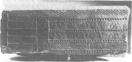 秦。长74厘米,宽25厘米,陕西省临潼县出土。陕西省博物馆藏。三幅画面由多种印模印捺成。分上、中、下三部分。上部的侍卫图由五名卫士组成,均头戴冠帽,身着长衣,执戟持盾,谦恭而立。中部的宴享图表现主宾对坐于列满耳杯、尊、壶等酒食器的席旁,边饮酒边欣赏乐伎表演的情景。下部的狩猎图分三排表现:在峰峦起伏,林木茂密,流云飞逸的山间,野兽或隐或现,一猎者正弯弓引箭,对准一只惊慌奔逃的小鹿,气氛十分紧张。构图简练,刻画生动,是迄今发现的秦代模印画象砖中内容最丰富的一件。
