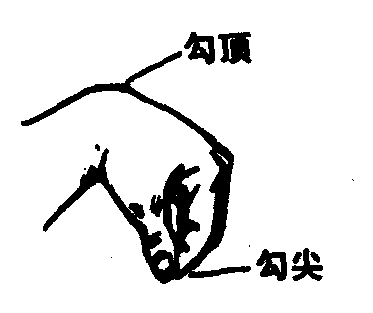 勾型方位用语。又称“横勾手”。以左手为例,左臂侧平摆,勾尖朝后,勾顶朝左。