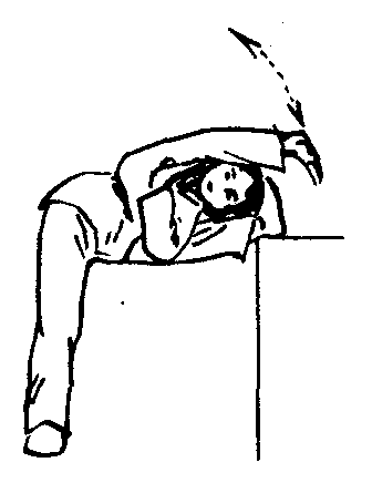 压腿方法之一。侧对肋木或一物体;一腿直立,另一腿,脚跟搁在肋木上,脚尖勾起,踝关节紧屈,两腿伸直,立腰、开髋,上体向侧压振,逐渐加大振幅,使头侧、耳能触及脚尖。练习时,左右交替, 由低渐高。