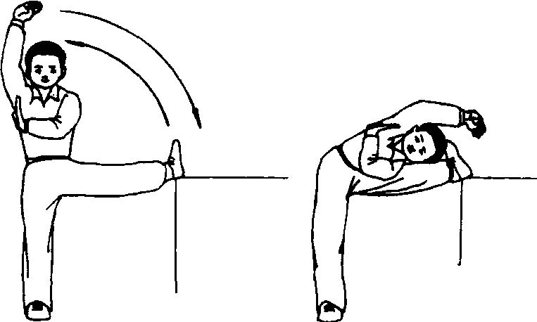 腿功之一。侧对肋木或一定高度物体站立,右腿支撑,左腿脚跟放在肋木上,脚尖回勾,右臂屈肘上举,左掌附于右胸前立掌。两腿不得弯曲,开髋,上体向左侧压。练习时要左右腿交换进行,其它要求与正压腿相同。(图2—4—6)