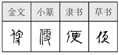 便 金文; 篆biàn,pián[亻(人,意符)+更(金文是”以手執鞭,意符)→便(《説文》:“便,安也。有人不便更之。從人更。”不確。唐蘭認爲金文像手持鞭鞭打人之背形。“便”爲“鞭”本字。借爲便利〈方便,輕便〉,引申爲方便的時候,或順便的機會〈便車,便宜〉。行行方便〈大便,小便〉。不按正規〈便衣,便條,便飯〉。通“就”〈一學便會,一問便知〉。)] [西漢] 劉向《戰國策·趙策四》:“衣服使之便於體,膳啖(dàn同啗)使之嗛(xián同銜,含於口)”(衣服適合身體,食物適合口味。) [明] 施耐庵《水滸傳》(第三九回):“好歹只顧拿來,便走不動,扛也扛將來。” 便(9画) ❶biàn ❷pián