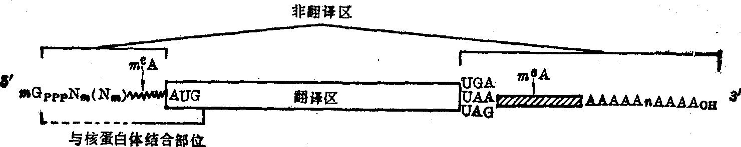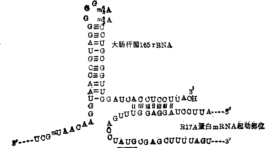释义 | 信使核糖核酸(mRNA) 信使核糖核酸(mRNA)信使核糖核酸在细胞中的含量约占总RNA的5%以下,其量虽少,但在蛋白质生物合成中却起着关键性的模板作用。它在细胞核或拟核区域由DNA转录生成,并经加工处理后,进入细胞质可以自由存在,但主要是与多个核蛋白体结合成串珠样的多核蛋白体的形式而存在。mRNA的种类繁多,从理论上讲,真核细胞中含多少种蛋白质或肽链,就必然含多少种mRNA,但在原核细胞中的种类却要少得多。各种mRNA的分子大小颇不一致,相差悬殊,一般由数百个至数千个核苷酸组成,沉降常数为8S至30S,分子量约为20万至200万道尔顿,但个别mRNA可能更大或更小,例如蛋丝纤维蛋白mRNA的分子量可大至600万以上。mRNA一般都不稳定,代谢活跃,更新迅速,寿命较短,原核mRNA的此种现象较真核mRNA尤为显著,前者半寿期只有数分钟,但后者的也不过数小时或数天。mRNA的基本组成单位也都是腺嘌呤(A)、鸟嘌呤(G)、胞嘧啶(C)、尿嘧啶(U)四种碱基的相应核苷酸,分子中一般不含稀有核苷酸(原核mRNA)或含量极少(真核mRNA);这些核苷酸的含量没有一定比例,它们按照一定的排列顺序,通过3′,5′磷酸二酯键彼此相连而形成一条很长的多核苷酸链,链本身可有多处折叠造成发夹式结构,并形成许多小双螺旋。但不同mRNA所含发夹式结构的数目、长短、相对位置等各不相同,即其二级结构没有共同的形式和规律。一级结构与功能关系 原核生物mRNA与真核生物mRNA的分子结构组成具有很大差别。绝大多数原核细胞的mRNA,包括嗜菌体RNA,都是多顺反子型信使,即一个原核mRNA分子中带有几种蛋白质的信息,可作为合成几种蛋白质的模板,它们都是能为几种蛋白质编码的操纵子的转录物或自身复制物。例如大肠杆菌中由 图1 原核mRNA的结构模型(噬菌体MS2的结构) ![]() 图2 真核mRNA的结构模型(哺乳动物) 图3 原核mRNA(噬菌体R17A蛋白顺反子)起动部位与核蛋白体30S亚基的16S RNA的碱基互补结合 非翻译区及其功能 mRNA分子中的非翻译区首先是在噬菌体MS2的RNA中发现的,它含有四个非翻译区,即5′非翻译区、3′非翻译区以及位于其翻译区之间的另外两个非翻译区,它们分别由129个、174个、26个及36个核苷酸组成,核苷酸的排列顺序都已全部确定,它们之中有的含有几个AUG或几个GUG,但无一具有起动信息。mRNA非翻译区虽无编码和模板作用,但在蛋白质生物合成中仍然非常重要,就噬菌体MS2或R17者来说,此区至少有下列两种功能: ❶因含有终止信号,可保证蛋白质的翻译过程按时停止。 ❷与核蛋白体小亚基结合,构成mRNA的起动部位,其结合机制已被基本确定,主要根据是: 多种原核mRNA及噬菌体RNA的各非翻译区序列中,在距离相邻翻译区起动密码子AUG前的7~10个核苷酸处,都有一段富于嘌呤核苷酸的序列; 而一切细菌核蛋白体小亚基(30S)中16S rRNA的3′末端的12个核苷酸,都是一段富于嘧啶核苷酸的序列,即……AUCACCUCCUUAOH,此二者可以互补结合,至少生成4~7个连续的碱基对(图3)。原核mRNA与核蛋白体小亚基如此相互结合的机制常被称为Shine-Dalgarno定则,但有些事实说明它未必是唯一的结合方式。真核细胞mRNA分子中的非翻译区包括5′端及3′端两部分,其功能可能类似原核mRNA的非翻译区,但与原核mRNA相比,真核mRNA的非翻译区具有两大特点: ❶5′非翻译区的5′末端为由1~3个稀有核苷酸形成的一个特殊结构区,常称为“帽子”。 ❷3′非翻译区的3′端为由30~200个腺苷酸聚合成的所谓 “多聚A尾巴”。根据所含甲基化稀有核苷的数目,5′帽子可有下列三种类型,即m7GpppNp……、m7GpppN1mpNp…和m7GpppN1mpN2mpNp…; 其中7-甲基鸟苷(m7G)中有一个质子解离上去而形成偶极离子; N1m和N2m代表四种2′-o-甲基核苷中的任何一种,即Am、Gm、Cm或Um,但N1m也可能是m6Am; m7G通过三个磷酸基与Np或Nmp以5′,5′键相连,其结构式如下。 5′帽子的存在对于mRNA的翻译作用即促进蛋白质生物合成的能力至关重要,这可能是由于: ❶它能阻止5′外切核酸酶对mRNA的降解作用,使mRNA的稳定性增加。真核mRNA的半寿期何以普遍长于原核mRNA者,可能就是由于此故。 ❷它是核蛋白体小亚基识别mRNA的信号并与之结合的部位,因而参与蛋白质的起动作用。真核mRNA的3′聚A尾巴最初是在哺乳动物mRNA中发现的,随后在多种昆虫、植物、酵母等mRNA分子中也都发现。3′聚A中腺苷酸数目不等,一般为30~200个,越高级的真核细胞mRNA所含聚A中的A数越多,反之越少。真核mRNA的前体HnRNA也含3′聚A,但此聚A不是由DNA转录而来。而是HnRNA在转录完成之后于3′末端一个A一个A加上去的,催化此反应的酶为聚A聚合酶,所需原料为ATP,但GTP、CTP、UTP对此酶则有抑制作用。各种真核mRNA的3′非翻译区中,在距离3′聚A约20个核苷酸处有一段共同的序列AAUAAA,可能是聚A聚合酶的识别及结合部位。至于3′聚A的功能虽有多种推测和说法,但实验结果极其混乱矛盾,至今仍无定论,总的估计它可能与维持并稳定mRNA的二级结构有关,从而有利于蛋白质合成的进行。 二级结构 无论真核mRNA或原核mRNA的一级结构都是单股多核苷酸链,但当加热后都可引起变性,表现增色效应;若用核糖核酸酶A或T1处理时,链的某些部位比较敏感,但有些部位则不太敏感,这表示mRNA链可有多处能够自身折叠而形成发夹式结构,并为X线衍射所证实。但不同mRNA所含发夹式结构的数目、长短、相对位置等都不相同,即不同的mRNA具有不同的二级结构