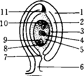 释义 | 倒生胚珠anatropous ovule珠孔面向胎座,合点在上的一种本体倒转类型的胚珠。此类胚珠在其发育过程中,由于一侧生长迅速,致使胚珠于合点处倒转180°,但珠心不弯曲,珠孔和合点通过珠心连成直线。倒生胚珠是被子植物中最普遍的一种类型,如菊科、葫芦科、百合科、禾本科等许多植物的胚珠。 倒生胚珠 1.外珠被 2. 内珠被 3. 珠心 4. 极核 5.胚囊 6. 珠柄 7. 珠孔 8. 助细胞 9. 卵细胞10. 反足细胞 11.合点 |