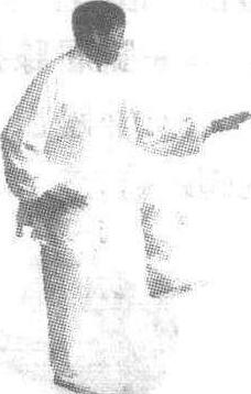 陈式太极拳式之一。为陈式二路太极拳中的动作。双臂由合而开,随之提左脚,以右脚为轴心转动身体,右手合于左肘下,左腿虚起。如图。