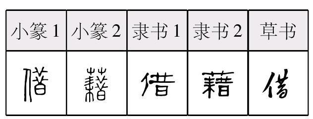 另见:虚构 ☚ 讽喻 引用 ☛ 借借进,借出:~光/~去/~春/~问/~鉴/~贷/~词/~调/~道/~据/~款/~用/~支/~重/拆~/典~/挪~/租~/摘~/~箸代筹。 借jiè子夜切,去祃。 ❶借出,借入。《史记·周本纪》:“~之畏于韩,不~畏于秦。” ❷凭借;利用。朱锡绶《幽梦续影》:“善诈者~我疑,善欺者~我察。” ❸怜惜;宽容。《南史·齐纪》:“明审有吏才,持法无所~。” ❹奖许,推重。见“优借”。 ❺连词。假设,假如。《诗·大雅·抑》:“~曰未知,亦既抱子。” 〖借〗 粵 ze3〔蔗〕普 jiè ❶ 借入,借出。許慎《說文解字》:「〜,假也。」宋濂《送東陽馬生序》:「每假〜於藏書之家,手自筆錄,計日以還。」 ❷ 多與「使」組成詞語「〜使」,指假使。陳壽《三國志.魏書.荀攸傳》:「〜使二子和睦以守其成業,則天下之難未息也。」(二子:袁紹的兒子袁譚、袁尚兩兄弟。)