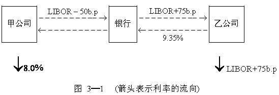 在此条件下,如果甲公司发行固定利率债券,乙公司则以变动利率来筹措资金,此后,两公司之间安排利率调换,则两公司便可以合适的形式筹得必要的资金。假定利率调换通过一家银行进行,甲、乙两公司的利率支付如图3-1所示: 在这里,银行的活动是:对甲公司,收取(LIBOR—50b. p.)的利率,用以支付8.0%的固定利率;对乙公司,支付(LIBOR + 75b. p.)的利率,收取固定利率9.35%。 通过调换,甲、乙两公司的筹资成本以及银行的利润如表3—3所示: 表3—3 进行利率调换