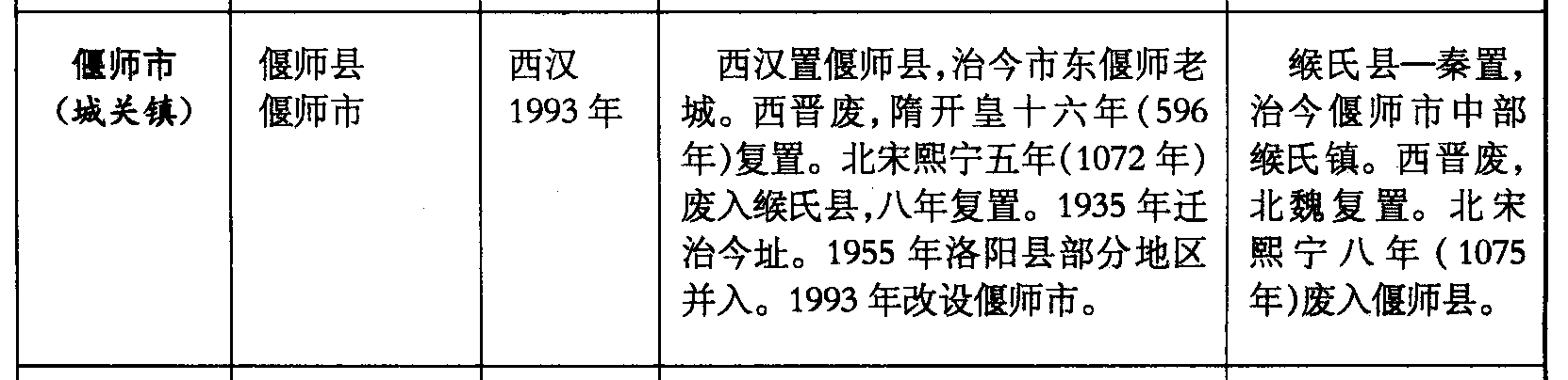 偃师市(城关镇)偃师县偃师市西汉1993年西汉置偃师县,治今市东偃师老城。西晋废,隋开皇十六年(596年)复置。北宋熙宁五年(1072年)废入缑氏县,八年复置。1935年迁治今址。1955年洛阳县部分地区并入。1993年改设偃师市。缑氏县—秦置,治今偃师市中部缑氏镇。西晋废,北魏复置。北宋熙宁八年 (1075年)废入偃师县。