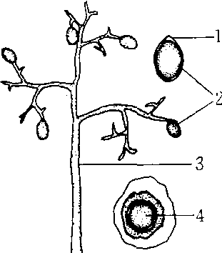 释义 | 假霜霉属Pseudoperonospora鞭毛菌亚门,霜霉目。菌丝体生在寄主细胞间,无色,无隔膜,吸器小,球形或略呈裂瓣状。孢囊梗有限生长,从寄主气孔伸出,单枝或多枝,主轴基部略膨大,向上单轴分枝,再作不完全对称的二叉状锐角分枝数次,末枝较柔软,顶端尖细;孢子囊单生在末枝顶端,卵圆形、梨形或椭圆形,淡灰色或淡褐色,顶部有较浅的乳突,同步成熟,脱落,常有短柄,萌发常产生游动孢子。卵孢子卵圆形,壁薄,平滑或粗糙,淡黄色至黄褐色,单生,不满器。本属菌专性寄生,常见的有古巴霜霉[P. cubensis (Berk. et Curt.)Rostov.],引致瓜类霜霉病。 假霜霉属 1.乳突 2. 孢子囊 3. 孢囊梗 4. 卵孢 |