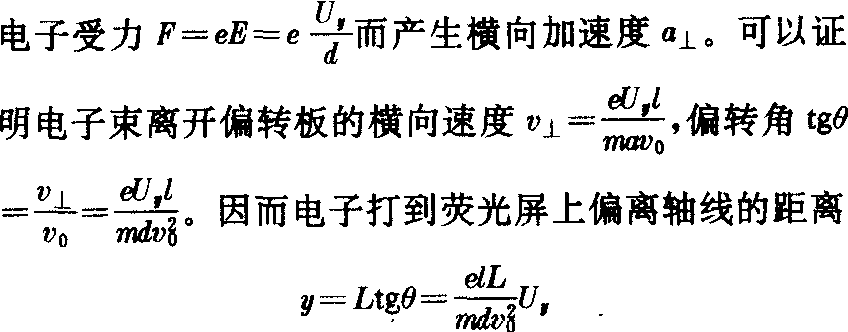 释义 | 偏转电极 偏转电极pianzhuan dianji控制运动带电粒子偏转的系统。示波器的重要部分是示波管,用以在其荧光屏上显示被测电信号的波形。在接近真空的示波管内主要有两个部分,一是电子枪,用以产生可控制的电子流,一是用来偏转电子束的静电偏转系统,由垂直偏转板和水平偏转板构成,附图为垂直偏转系统示意图。 电子以v0沿轴线水平进入垂直偏转电极,偏转电极为两平行平板,板间距离d远小于板的线度l,设板间电压为Uy,忽略边缘效应可视两板间为匀强电场 ![]() ![]() 若用第二阳极电压Ua(一般电子束速度v0由偏转板前 ![]() 即荧光屏上电子打击的光点的位移y正比于加在偏转板上的电压Uy。若Uy=Umsinωt,则 y=hyUmsinωt 荧光屏上光点随偏转电压正弦变化。 ☚ 电势梯度 基本电荷 ☛ |