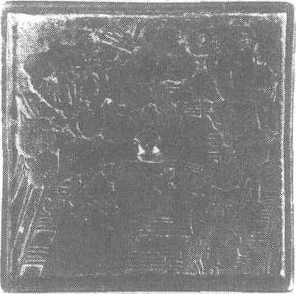 宋。边宽10.9厘米,边厚0.2厘米,纽高0.2厘米。北京中国历史博物馆藏。铜镜方形,背面中央有圆形素钮,钮外饰傀儡戏图,是表演杖头傀儡的情景。远景有一殿陛,可见有高石台阶、勾栏、手杖,近景台阶下支一幕布,即帏帐,一束髻童子居幕后,双手各举一杖头傀儡,高出帏帐之上作挑弄状。左手所举傀儡,手持长兵器,面右作进攻状;右手所举傀儡,是一武将形象,身着战袍,手持长矛,威风凛凛地面左作迎战状,看来是演武打之戏。帏帐前左有三童,执锣击节,地上放拍板一具,看似是木偶戏的乐队。帏帐右有二童,身穿锦衣端坐幕前石阶上,似为助兴演戏的观众。整个画面设计自然大方,精巧严谨,人物景物生动活泼,栩栩如生,线条细腻流畅洗炼。傀儡戏,今称木偶戏,是我国一种古老民间戏剧艺术,宋有杖头傀儡、悬丝傀儡、药发傀儡、水傀儡,此镜画面上的当为杖头傀儡。