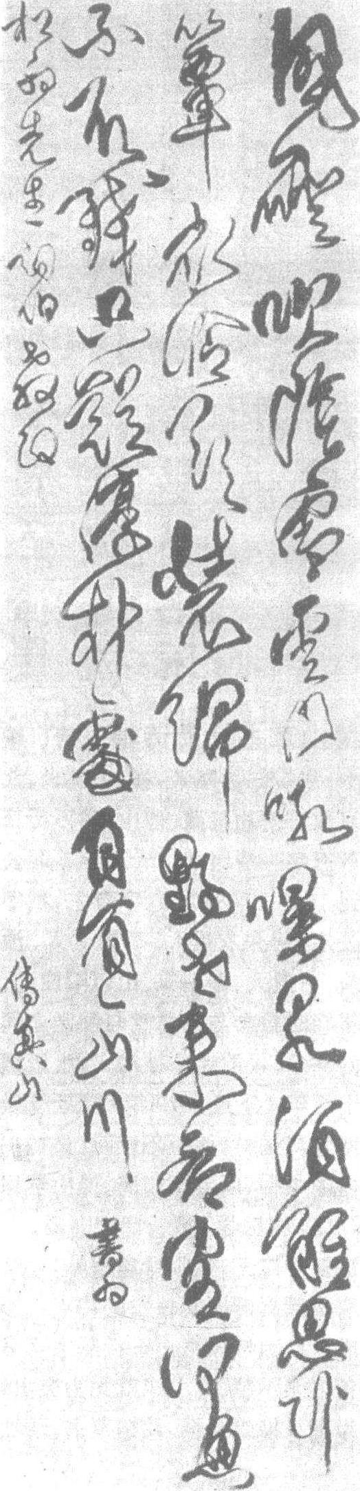 清。绫本。纵185.7厘米,横51厘米。北京故宫博物院藏。傅山(明万历三十五年—清康熙二十三年,即公元1607—1684年),字青主,别字公宅,号朱衣道人、侨黄老人、浊翁、石道人、真山等。山西阳曲人。年轻时曾参与东林党与阉党之间的斗争。入清后曾被捕入狱。康熙十八年(公元1679年)清廷特设博学鸿词科,傅拒不应召。又特加内阁中书,以老病相辞。傅山学识广博,精医学,擅长诗文书画。书法初学二王,遍临晋唐法帖,后又取法颜真卿厚实朴质的特点,形成自己独特风格。正行篆隶草书各体无不精。草书成就尤为突出,为世人推崇备至。此幅草书,录杜诗一首,气势豪迈,一气呵成,笔力雄健纯熟,挥洒自如,点画腾挪,极富节奏感,是其草书代表面目和优秀作品。尝自论书曰:“宁拙毋巧,宁丑毋媚,宁支离毋轻滑,宁真率毋安排。”这正是他的书法成就的关键所在。