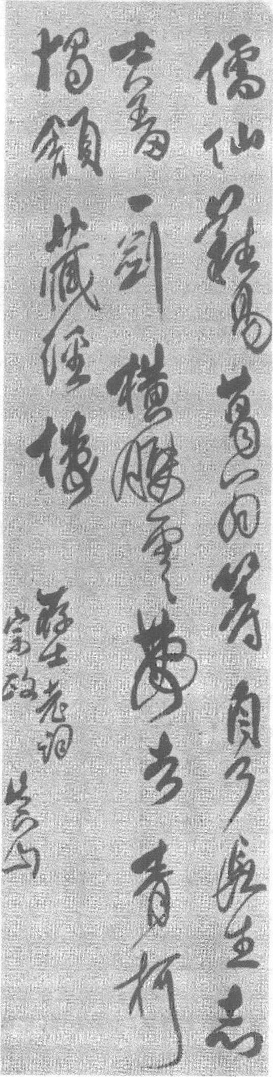释义 | 傅山行草书七言绝句诗轴 傅山行草书七言绝句诗轴清。绫本。纵187.8厘米,横51.4厘米。江苏省苏州博物馆藏。傅山(见《傅山草书诗轴》条目)书。此幅七言绝句:“儒仙难易葛翁筹,自了长生志士羞,一剑横腰云梦去,青柯独颔藏经楼。”下款署:“存士老词宗政,傅山。”傅山以“行草为最”,此行草相参,行笔由缓至疾,如“儒仙”行笔较缓,下接疾笔“难”字,有如疾风骤雨,一气呵成,笔力雄健刚劲,墨笔酣畅淋漓。结体以纵取势,章法布局安宁中有跳宕,倾斜中有稳妥,气韵生动而富于变化。 ☚ 傅山草书诗轴 王铎草书琅华馆学古帖卷 ☛ |