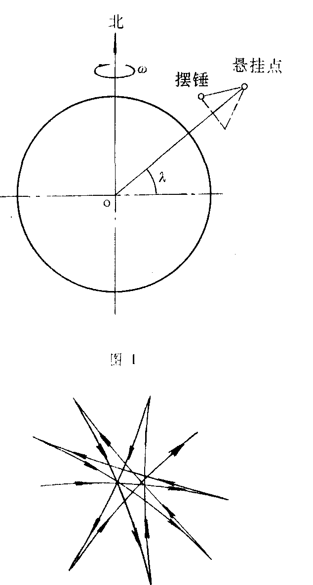 释义 | 傅科摆用以证明地球绕轴自转的装置。法国物理学家傅科(J.B.L.Foucault,1819~1868)发明。主要用一根69m长的钢绳悬挂一个28kg重的铁球构成。以此证明地球自转角速度为15°/h。此实验首次作于1851年巴黎。但傅科摆的偏转速度为15°sinφ/h。 傅科摆 傅科摆fukebai为了证明地球在自转,法国物理学家傅科(Jean Bernard Leon Foucault 1819—1868)于1851年做了一次成功的摆动实验,傅科摆由此而得名。实验在法国巴黎的一个圆顶大厦进行,摆长60米,摆锤重28公斤,悬挂点经过特殊设计使摩擦减少到最低限度。这种摆惯性和动量大,因而基本不受地球自转影响而自行摆动,并且摆动时间很长。在傅科摆实验中,人们看到,摆动过程中摆动平面沿顺时针方向缓缓转动,摆动方向不断变化。分析这种现象,摆在摆动平面方向上并没有受到外力作用,按照惯性定律,摆动的空间方向不会改变,因而可知,这种摆动方向的变化,是由于观察者所在的地球在沿逆时针方向转动的结果,地球上的观察者看到相对运动现象,从而有力地证明了地球是在自转。傅科摆放置的位置不同,摆动情况也不同。在北半球时,摆动平面顺时针转动;在南半球时,摆动平面逆时针转动,而且纬度越高,转动速度越快;在赤道上的摆几乎不转动。傅科摆摆动平面偏转的角度可用公式θ°=15t sin ☚ 日界线 地球自转 ☛ 傅科摆 傅科摆fukebai用来显示地球自转效应的单摆。如果不考虑地球自转的影响,通常的单摆只受重力和悬线张力的作用,它的运动平面是不转动的。对于傅科摆,作用在它的摆锤上的力,除了重力和悬挂线的张力以外,还必须考虑由于地球自转而产生的科里奥利力的作用,人们发现它的摆动平面会慢慢地相对于地面旋转,这个实验是地球自转的直接证明。傅科摆的摆动平面旋转的原因如下:如图1,设一单摆悬挂在纬度为λ的北半球上,当摆在图示的子午平面内由北向南运动时,它将受到自东向西的科里奥利力的作用,使摆的摆动平面作顺时针偏转;当摆作自南向北的运动时,摆受到自西向东的科里奥利力作用,它的摆动平面继续作顺时针偏转,摆锤的运动轨迹如图2所示。可以算出,摆动平面的角速度为ωsinλ,其中ω为地球自转角速度,λ为单摆所在地的纬度。由此可知摆动平面转动的周期T=2π/ωsinλ。 图2 因为2π/ω等于一天,所以在纬度为λ的地方,傅科摆平面每转动一周需要时间为1/sinλ天。如果将傅科摆挂在北极(λ=90°),站在地面上的观察者将看到,摆动面以顺时针方向(即与地球转动方向相反),每天旋转一周。傅科摆与普通单摆相似,不过其摆锤的悬线可以在任何铅垂面内自由摆动,因而要有特殊的悬挂机构。由于地球的自转角速度ω很小,所以傅科摆的摆动平面的转动是很缓慢的。为了显示摆动平面的转动,必须使摆作长时间的摆动,因而其悬挂点必须几乎没有摩擦,摆锤必须做得很重,摆的悬线必须很长,以减小空气阻力的影响。法国实验物理学家傅科(J.B.L.Foucault,1819~1868)于1851年首先在巴黎(λ=48°51′)进行实验。他使用质量为28千克的铁球作为摆锤,摆长67米,测得摆动平面转动的周期是32小时,与理论预期值很好吻合,为地球自转提供了一个有力的证据。 ☚ 科里奥利力 开普勒定律 ☛ 傅科摆证实地球自转的仪器。法国物理学家傅科(Jean Bernard Léon Foucault,1819—1868)发明。由长10几米的细钢丝和重球组成。地球自转使摆平面相对地面的方向改变,周期因纬度而异(两极为24小时,赤道为0)。 |