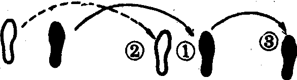 步法用语。指一脚向前(或后、或侧方)迈出一步,另一脚随之跟进落地的瞬间,先动之脚沿原前进(或后退、或侧移)方向再迈出一步的步法。其足迹路线如图。