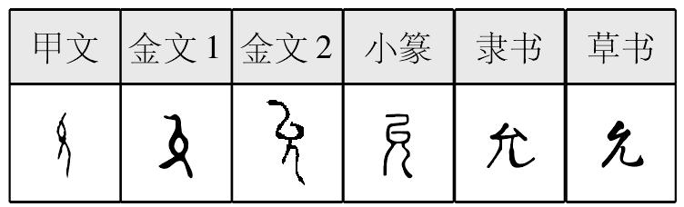 允 甲骨文; 金文; 篆yǔn[厶(口,意符)+兒(聲符)→允(《説文》:“允,信也,從以儿。”金文“允”像小兒吸奶形,吮本字。借爲允諾、允許;適當〈公允〉。)] 《詩經·鄘風·定之方中》:“卜云其吉,終焉允臧。”(占卜説吉祥,脚下是個好地方。) 允yǔn(4画)