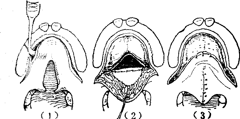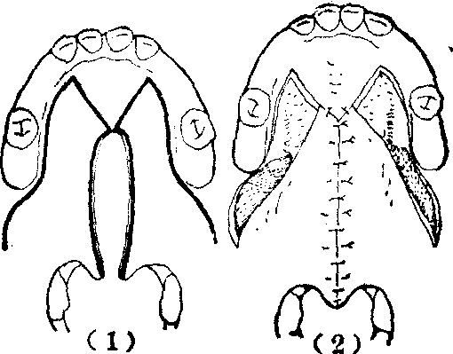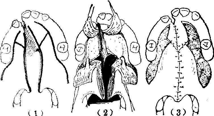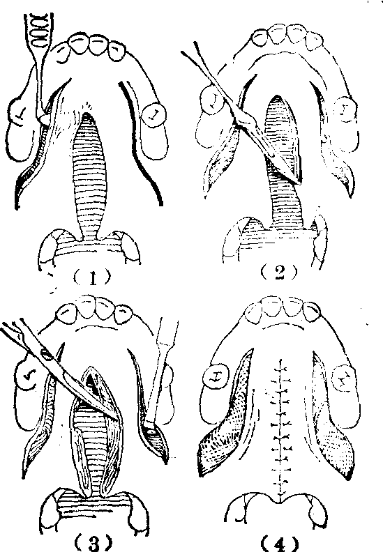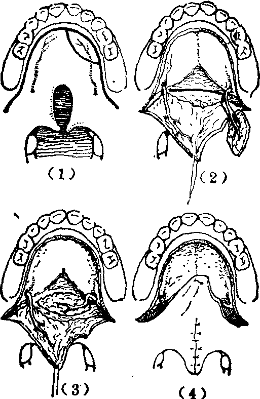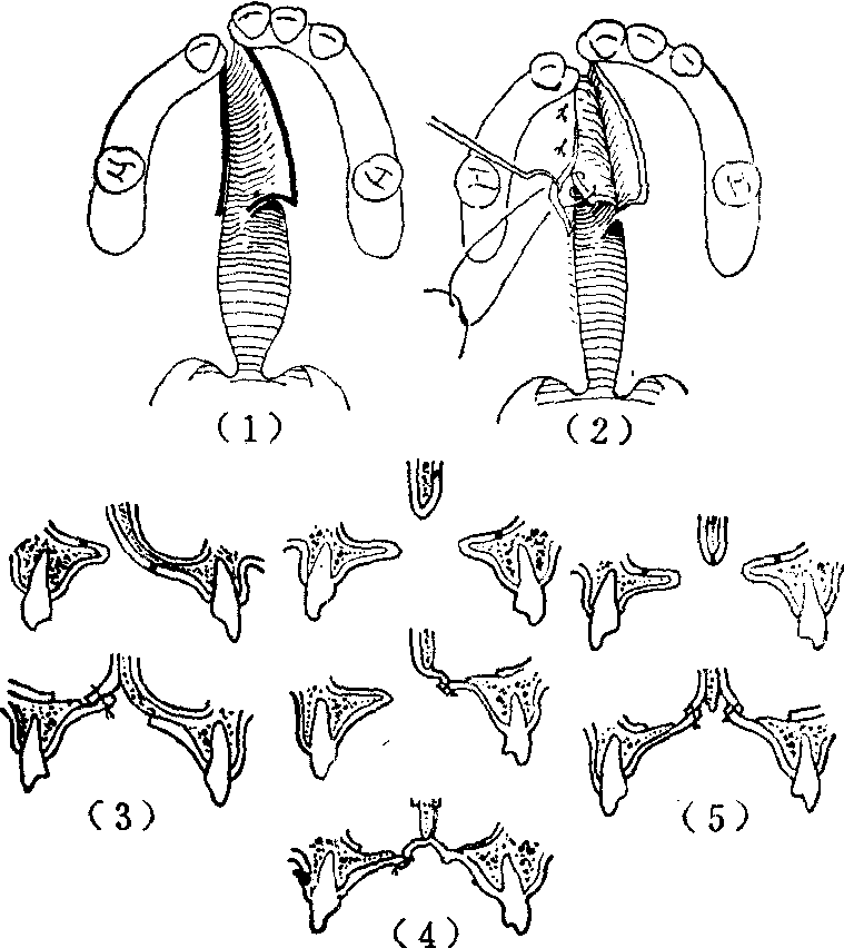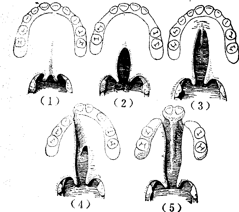 释义 | 先天性腭裂 先天性腭裂先天性腭裂俗名狼咽,是一种比较常见的先天性畸形。表现为上腭中线部位轻重程度不等的裂口。腭裂虽可单独发生,但多伴有先天性唇裂,故发生率的调查,亦多为唇、腭裂的混合统计,据国内外的资料表明,大致为1‰。如将唇裂、唇裂伴有腭裂、腭裂分别计算,则单纯唇裂的发生率最高,唇裂伴有腭裂次之,单纯腭裂最低。 图1 腭裂的分类 先天性腭裂,因其解剖上的缺陷,可以引起多方面的生理功能障碍,其轻重因裂口的部位和程度而有所不同。伴有唇裂时,则功能障碍更为加重。上腭由硬腭和软腭共同构成。硬腭为骨性结构,包括上颌骨的腭突和腭骨水平板,无运动功能。位于鼻腔和口腔之间,将两腔完全分隔。软腭为肌性结构,包括腭舌肌、腭帆张肌、腭腱膜、腭帆提肌、悬雍垂肌等(图2),具有极为灵活的运动功能,在咽部肌肉的协调配合下,按照生理需要,可以自由地控制存在于软腭与咽壁间,亦即鼻咽腔与口咽腔之间的通道,急速启闭,成为对吞咽,特别是发音具有极为重要作用的腭咽闭合功能。另外,腭帆张肌、腭帆提肌和咽鼓管咽肌的收缩,使咽鼓管口开放,以调节鼓室内外空气压力的平衡,维持正常听力。在有腭裂的情况下,腭部的裂口,使鼻腔和口腔贯穿,畅通无阻。软腭部肌肉发育不良或萎缩,左右分离,位置失常。且腭部长度不足,造成腭咽闭合不全和咽鼓管功能不良。因此,患儿于出生后,即因口鼻腔直接通连,不能在口腔内形成负压,而致吮乳困难。但可用羹匙或滴管将食物送入口腔后部,虽有时从鼻孔漏食或发生呛咳,如能耐心喂养,患儿仍可正常发育成长。开始学语时,因腭咽闭合不全,发音呈有浓重鼻音、含混不清的腭裂音质。咽鼓管功能不良及常常并发的中耳炎,可造成听力障碍。这也可能是影响正确发音的因素之一。因不能在口腔内聚集有一定压力的气流,故无法吹气或学习吹奏乐器。此外,鼻咽部由于冷空气的直接刺激,冬春之际,易患上呼吸道感染。 图2 腭部肌肉的正常和病理解剖右侧为正常解剖, 左半为裂侧。 先天性腭裂的治疗,主要目的在于恢复正常或接近正常的以发音为主的生理功能。整形手术修复虽属主要手段,但良好疗效的获得必须由有关各科互相配合进行综合治疗。如儿科的营养指导,以保持患儿健康的成长发育。耳科对中耳炎的治疗。口腔科采用正畸牙托、矫正器等纠正切牙骨、牙槽突、腭弓等的畸形,以利日后整形修复手术的进行,并为正常生理功能的恢复,创造良好条件。腭裂伴有唇裂时,应先行唇裂修复手术,有助于腭裂裂口宽度的缩窄,可以降低随后进行的腭裂修复术的难度。对年龄较大的患者,腭裂和唇裂可在同一次手术内修复。腭裂术后还常需进行语音治疗,以进一步发挥手术成果,取得较好的语音疗效。 关于先天性腭裂的手术年龄,为能尽早提供正确发音的条件,应以早期手术为原则,多认为以2~4岁开始学话时为宜。因一旦腭裂语音习惯已经养成,改正常甚为困难。但也需视患儿的全身情况、营养状态、所拟采用手术方法的繁简难易等多方面因素综合考虑决定。一般最迟也应争取在学龄前完成。由于麻醉和手术操作技巧的不断进步,早期手术的安全性已有保证。且较普遍地认为早期手术并不致引起上颌骨的发育障碍而造成碟状脸畸形的不良后果。畸形严重,或因故不宜早期手术者,须及时行口腔正畸治疗,以防止畸形的继续进展,降低日后修复手术的难度和提高治疗效果。 先天性腭裂的术前准备是保证手术修复过程中安全的重要环节。术前须仔细检查及了解有无妨碍施行手术的其他合并先天性畸形,营养状况,有无鼻咽部或中耳的感染,近期曾否发生呼吸道感染等,以便进行相应的处置后,选定适当的手术时间。但肿大的扁桃体和咽部增殖的腺样体,对腭咽闭合不全有代偿作用,一般不应先行扁桃体摘除或腺样体切除术。化验应包括与出凝血机制有关的检查,作好输血准备。如术后使用腭托,应预先试戴。 先天性腭裂修复手术,应在经口或经鼻气管内插管,并选用术后不易发生呕吐的全身麻醉下进行。术时,保持头部于充分后仰体位,使用带有压舌板的开口器,并备置良好的吸引器。 修复腭裂的手术方法很多,对不同手术方法的评价,应以能否有效地改正腭咽闭合不全为主要衡量标准,即不仅在于裂口的解剖修复,而更重要的是腭咽闭合的生理功能的恢复。腭裂修复手术已有悠久历史。早期的手术设计多着眼于单纯闭合裂口的解剖修复。这类手术可以两侧松弛切口为原则的Langenbeck手术为代表。其后逐渐认识到延长腭部对恢复腭咽闭合功能的重要性。这类手术可以后推为原则的Dorrance手术为代表。其后,随着对功能疗效的不断分析总结,进一步确认,避免切断出自腭大孔的血管神经束,和完全消除鼻侧创面,以防止发生肌肉萎缩瘫痪和瘢痕挛缩,保持软腭肌肉的灵活运动功能和腭部所延长长度的稳定等的必要性。上述进展,逐步推动腭裂修复手术方法的不断改进提高而日趋完善。以下简介几种具有代表性的手术方法。 两侧松弛切口缝合术又称为Langenbeck手术。此法创始甚早,久经实践考验,为腭裂的经典手术方法之一。其后不少新的手术设计均以此法的基本原则和技术操作为依据,迄今仍不失为腭裂修复术者所应熟练掌握的基本手术之一。手术步骤包括于上腭作两侧减张切口,剥离形成粘