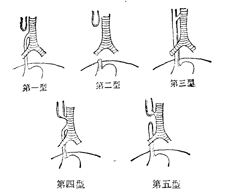 食管闭锁及食管气管瘘的几种类型 本病一般可分为五个类型(见图)。第一型:食管上段为一盲端,下段与气管相通,其相通点一般多于气管分叉处或稍上处。食管两端间距离不等,近者不及1cm,远者可达2~3cm(两段间距离越近,越有利于手术)。此型最多见,约占86.6%。第二型:食管上下两段不相连接,各成盲端,均与气管不相通,两段间距离长短不一 (距离多较远),下段盲端多仍在膈上。此型约占7.7%。第三型:食管与气管中的一部分相通,此型约占4.2%。第四型: 食管上下段分别与气管通连,此型占0.8%。第五型: 食管上段与气管相通,下段呈盲端者占0.7%。 临床突出的症状为小儿生后即见唾液增多,频吐泡沫,常出现呛咳、呕吐、窒息、青紫。其母妊娠期羊水过多(有人认为是胎儿不能吞入羊水所致),此时常误诊为羊水吸入。随后,每当喂食后立即发生呕吐,或呛咳、窒息等表现。如食管盲端和咽喉部有分泌物积聚时,呼吸时可有声响,且呼吸困难逐渐加重。如能及时清除咽喉部液体,可使症状好转; 但以后每当进食,症状又反复出现。患儿很快出现失水和消瘦。出生后无胎粪,仅见少许肠粘液排出。如患儿未能及时得到诊断与处理,终因窒息或肺炎而死亡。吸入性肺炎发生的早晚和病变轻重与畸形的类型有一定关系。一般除肺炎体征外,如有食管气管瘘则见腹部胀气,叩诊呈鼓音,表示腹部有气体。如腹部平坦或呈舟状腹,则多属元气管瘘的第二型。本病应于生后1~2天内尽快作出诊断,以便及早进行手术。当疑为本病时,可目鼻孔插入8号导尿管,如进至8~12cm时,遇有阻力或折回,则须进一步作X线平片检查,观察导尿管插入后的情况: 必要时尚可从导管注入0.5~1ml碘油,可见食管阻塞位置及有无瘘管与气管相通。如食管下段与气管形成瘘管,则可见胃肠道充气。否则胃肠道无气体。一般造影不作为常规检查,以免增加吸入性肺炎的可能性。 本病常伴发其他畸形如肠梗阻、先天性心脏病等,常易发生漏诊或误诊; 如将本病的吸入性肺炎误作新生儿肺炎,吃奶后发生呛咳、青紫、窒息误认为先天性心脏病症状,可延误手术机会。 预后好坏与是否及时诊断、肺炎的轻重及畸形情况有关。如能及早手术,避免反复吸入性肺炎,预后尚好。术前注意控制感染,纠正脱水和电解质紊乱,补充营养,加强护理,保暖和供氧,采取半卧位,经常注意用导管将分泌物吸出,禁止由口补充营养及水分。必要时可输入适量血浆。本病治疗关键在于手术,具体手术措施当视畸形情况而定。 ☚ 唾泪腺肥大综合征 食管痉挛 ☛ |