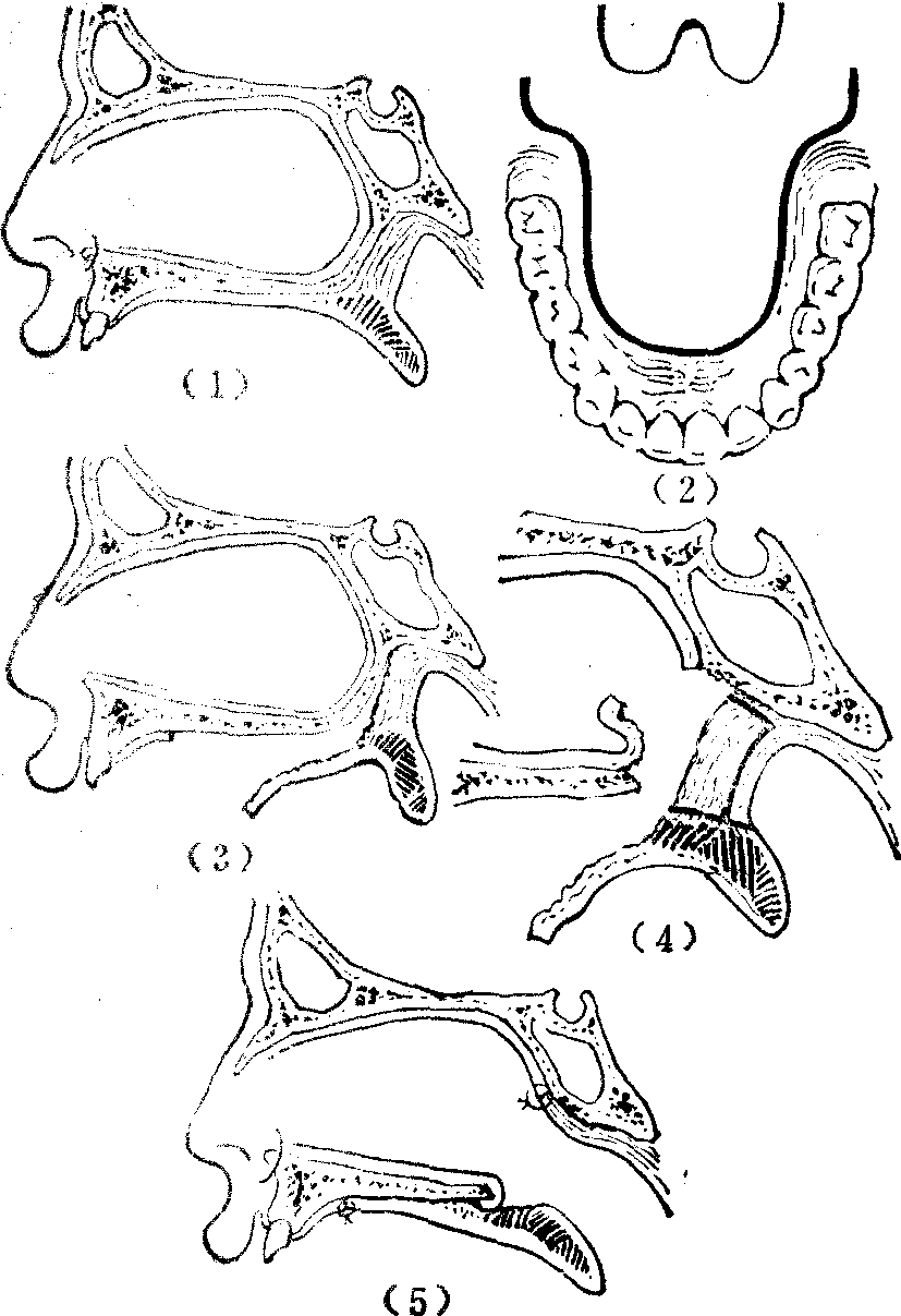 释义 | 先天性鼻后孔闭锁 先天性鼻后孔闭锁先天性鼻后孔闭锁,系在胚胎第7周时,分隔原始鼻腔与原口间的颊鼻膜未能如期破裂、吸收以形成后鼻孔将口鼻两腔贯通所致。可为单侧或双侧、完全或不全闭锁,可为膜性闭锁,如膜间有中胚层组织存留形成骨骼时,则成为骨性闭锁。闭锁部位在硬腭后缘的稍上方,一面为鼻腔粘膜,另一面为咽部粘膜覆盖。闭锁的厚度1~10mm不等。 经腭手术治疗鼻后孔闭锁 治疗措施,发生于新生儿时期的呼吸困难或窒息,只须插入口腔导气管即可缓解并维持良好呼吸。彻底解除只有依靠手术方法。手术时间选择,应根据不同类型、症状轻重、全身状况、有无其他伴发畸形等因素综合考虑确定。双侧完全闭锁以尽早施行手术为原则,单侧或不全闭锁可延缓至4~5岁时进行。手术有经鼻和经腭两种方法。 ❶经鼻手术。可使用乳突刮匙操作,将闭锁部的鼻侧粘膜和骨壁破穿,取除碎骨后,再将咽侧粘膜呈星状切开,使鼻咽间畅通无阻。用硅胶管穿过新形成的鼻后孔留置在鼻道内,4周后取出,以后每隔2~3日用硅胶管往返疏通扩张数次,防止发生狭缩。 ❷经腭手术。在上腭作马蹄形切口(图(2)),剥起粘膜骨膜瓣显露硬腭后缘(图(3)),咬除闭塞鼻后孔的骨壁并切除局部增厚的组织(图(4)),分别将所形成的鼻侧蒂位在下方和咽侧蒂位在上方的粘膜瓣缝合修复鼻后孔下缘和蝶骨体前的创面(图(5)),并将剥起的上腭粘膜骨膜瓣缝回原位。 ☚ 先天性鼻裂 驼峰鼻 ☛ |