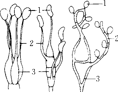 1.担孢子 2. 先菌丝(上担子) 3.冬孢子(下担子)