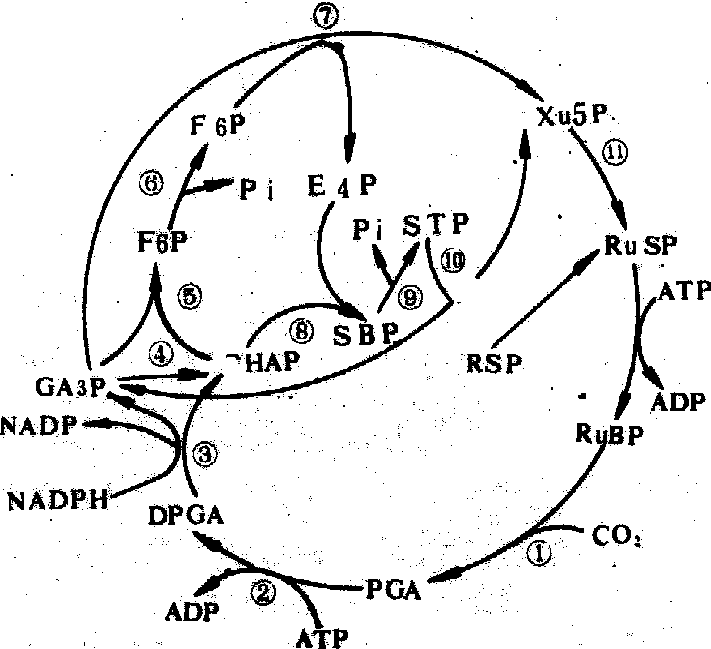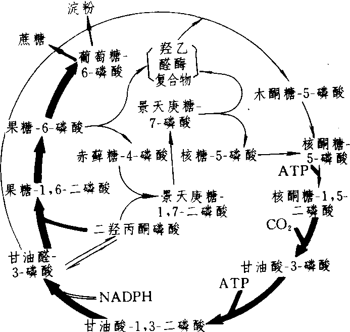 通过代谢物的运转也可调节光合作用的进行,如在C3途径中形成的磷酸丙糖从叶绿体运到细胞溶质,是与细胞溶质中的Pi一对一地交换进行,当植物缺磷时,与磷酸丙糖交换的Pi减少,使叶绿体内Pi减少,因而ATP/ADP比值降低,影响C3途径中需要ATP参加的反应——PGA激酶及Ru5P激酶所催化的反应(见图1中的反应 ❷及(3)的进行及C3途径的运转,使光合速率降低。同时由于缺Pi使磷酸丙糖运出受阻,因而留在叶绿体内转化为淀粉暂时贮存; 从叶绿体运到细胞溶质中的磷酸丙糖的减少又影响蔗糖合成。蔗糖是碳水化合物在植物体内运输的主要形式,因此缺Pi就导致光合产物的运输受阻,植物生长受抑制。但如Pi过多,则磷酸丙糖的输出又与其再生以及在叶绿体内形成淀粉相竞争,光合速率也降低,所以农业生产上应适施磷肥。 光合碳同化photosynthetic carbon assimilation利用光合电子传递和光合磷酸化过程中形成的同化力还原CO2形成糖或其他有机物的过程。碳同化途径分为C3途径、C4途径和景天酸代谢途径。C3途径又称卡尔文循环或还原磷酸戊糖途径,是光合碳同化的基本途径。该途径固定CO2的受体为二磷酸核酮糖(RuBP),参与的酶是RuBP羧化酶,产物为磷酸甘油酸(PGA),PGA还原酶利用NADPH还原PGA产生磷酸丙糖,进而可转化成多种碳水化合物,并通过环状代谢途径再生RuBP(图1)。C4途径于20世纪60年代由哈奇(M.D.Hatch)和斯拉克(C.R.Slack)首先发现。原初CO2受体是烯醇型磷酸丙酮酸(PEP),PEP羧化酶催化反应产生草酰乙酸,可转化为苹果酸(或天冬氨酸)并运至维管束鞘细胞,经脱羧所释放的CO2,须进入C3途径才能被同化为碳水化合物。景天酸代谢途径是多数肉质植物具有的一种碳同化途径。这类植物叶片上的气孔夜间开启吸收固定CO2,经C4途径,其羧化产物贮存于液胞中,至白昼再由液泡中转至细胞质,脱羧后进入C3途径,以完成其碳同化全过程。 卡尔文循环 粗线表示CO2转变为蔗糖、淀粉的途径 |