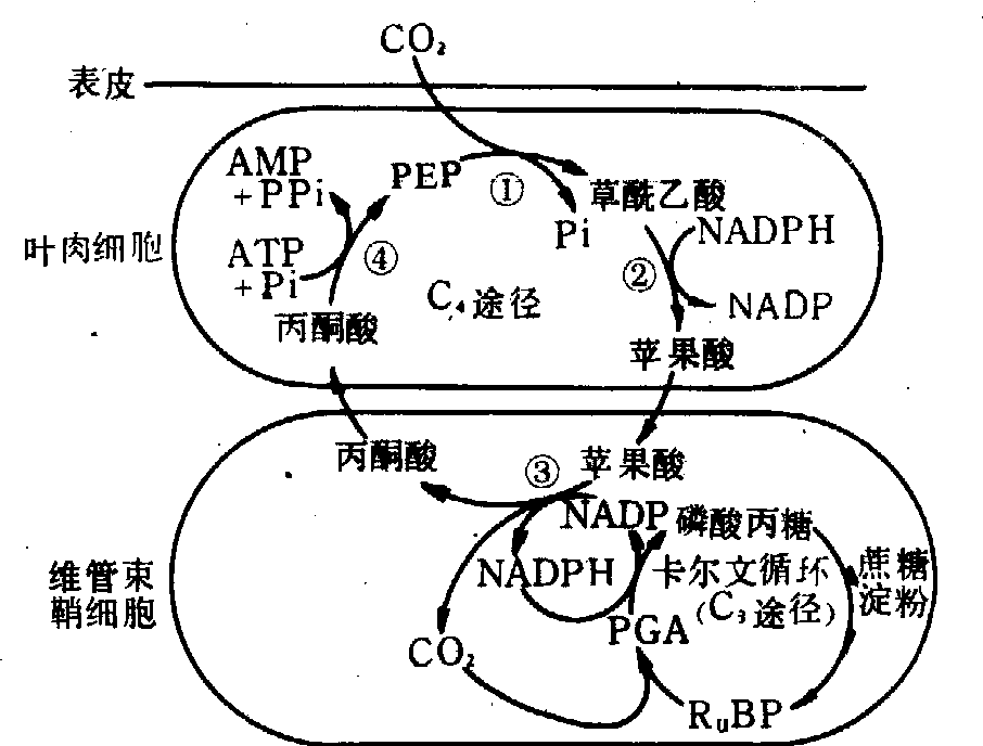 植物在CO2固定及同化过程中,环境中的O2常与CO2竞争RuBP及RuBP羧化酶-加氧酶,因该酶既可催化羧化反应,又可催化加氧反应,其反应方向决定于环境中CO2与O2浓度比值的高低。当其比值提高时,羧化反应占优势,有利于光合作用的进行。反之,则加氧反应占优势,形成磷酸乙醇酸,水解后即生成光呼吸底物-乙醇酸,有利于光呼吸的进行。C3植物在一般条件下该酶催化羧化反应的活性约为催化加氧反应活性的3~5倍。光合作用的卡尔文循环与光呼吸代谢途径(C2循环)是相联系的(见光呼吸)。 C4途径 又称哈奇—斯拉克途径。一些起源于热带的植物如玉米、高粱和甘蔗在进行光合作用时,CO2先与叶肉细胞内的磷酸烯醇丙酮酸(PEP)反应,固定在C4-双羧酸草酰乙酸中,然后草酰乙酸还原形成苹果酸,它从叶肉细胞转运到维管束鞘细胞,脱羧释放出CO2,同时形成丙酮酸。丙酮酸再转回叶肉细胞转化为CO2受体PEP,再固定CO2,如是循环; 在维管束鞘细胞内脱羧所释放的CO2即进入卡尔文循环(图2)。