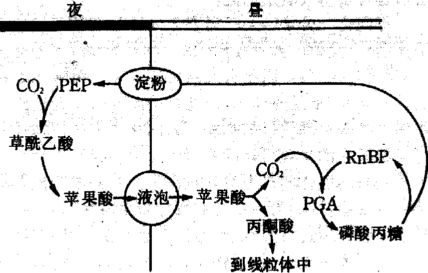 具有C4途径的植物称为C4植物。C4途径中形成的草酰乙酸也可经转氨作用形成天冬氨酸,后者从叶肉细胞转运到维管束鞘细胞后又转化为苹果酸,它脱羧释放出CO2进入卡尔文循环;脱羧后形成的C3化合物丙酮酸经转氨作用形成丙氨酸,丙氨酸转回叶肉细胞再转化为CO2受体PEP。 C4途径起CO2泵的作用,使C3途径可在CO2浓度高于大气的微环境中进行,因而这类植物的光呼吸较低。 景天酸代谢 这条代谢途径因首先在景天科植物中发现而命名; 以后又在其他肉质植物中发现。这类起源于热带的植物,气孔在夜间开放,白天关闭。夜间吸收并固定CO2,CO2受体亦为PEP,它与CO2反应形成草酰乙酸,然后草酰乙酸还原形成苹果酸,贮存在液泡内,白天转移到细胞质,脱羧释放出CO2进入叶绿体,经C3途径形成磷酸丙糖,进一步转化成淀粉贮存在叶绿体中。夜间淀粉降解,降解产物又形成PEP,又可作为CO2受体(图3)。景天酸代谢起了CO2库的作用,使这类植物白天在气孔关闭条件下仍有CO2进行光合作用。这一代谢途径是这类植物对炎热干旱环境的一种适应方式,夜间气孔张开、白天气孔关闭既可吸收到足够的CO2,又可减少水分消耗。 图 3 景天酸代谢途径 C3及C4途径的调节 C3、C4途径都可通过不同方式自动调节。一些酶在黑暗中呈钝化态,而在光下则呈活化态,C3途径中的RuBP羧化酶-加氧酶、磷酸丙糖脱氢酶、果糖-1,6-二磷酸酶、景天庚糖-1,7-二磷酸酶及Ru5P激酶以及C4途径中的丙酮酸、磷酸双激酶和NADP-苹果酸脱氢酶都是光调节酶。它们在黑暗中呈钝化态可保存底物,在光下呈活化态可促进C3或C4途径的运转。C3途径中形成的磷酸丙糖可转化为蔗糖或淀粉,亦可再进入循环形成更多的RuBP,这种反馈作用使循环运转加快,促进光合作用的进行,故有自动催化的性质。C4途径中催化CO2固定的酶——PEP羧化酶为磷酸己糖所活化,而为其产物C4-双羧酸所抑制(图4),葡糖-6-磷酸(G6P)或果糖-6-磷酸(F6P)活化PEP,当C4-双羧酸形成较多时则抑制PEP羧化酶作用,使C4途径的运转速度与维管束鞘细胞内的C3途径保持协调。