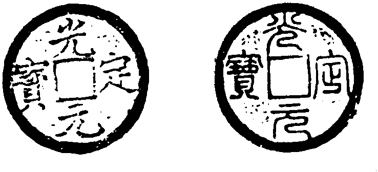 释义 | 古代名物 > 貨幣類 > 銅鐵錢部 > 西夏 > 光定元寳 光定元寳 guāngdìngyuánbǎo 西夏神宗光定年間(公元1211—1222年)所鑄漢文錢。僅見銅質小平,面文真、篆二體,旋讀。真書錢常於西夏故地出土,製作精好,書體微含行韻。篆書錢不見舊譜,唯近年寧夏賀蘭山一錢幣窖藏出土一品。錢文“光”、“定”、“元”三字篆書,“寳”字隸化。文體秀美,製作亦工。此錢之問世爲西夏錢幣又添新品,亦表明西夏幣制猶存對錢之遺風。一般徑二·四厘米,重三·四至四·四克。參閱清·初尚齡《吉金所見録》、清·李佐賢《古泉滙》。 光定元寳 |